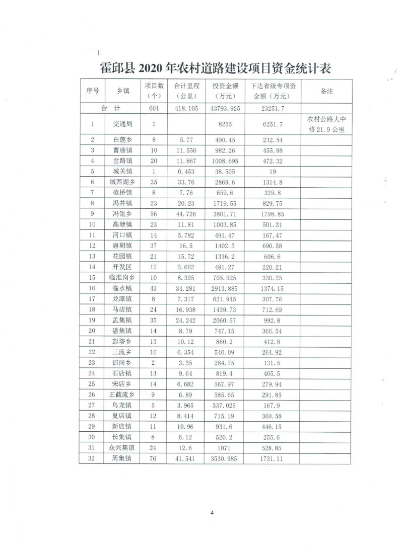 | 名 称: | 霍邱县2020年农村道路建设项目资金统计表 |