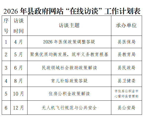 为进一步做好政策解读工作,强化政府与公众的互动交流,积极主动回应社会关切,按照《霍邱县人民政府办公室关于进一步规范和加强政策文件解读工作的通知》(霍政办秘〔2024〕18号)对解读形式及频率的要求,综合县政府工作重点和“在线访谈”承办单位网上调查结果,现安排县教育局等6家单位为2026年县政府网站“在线访谈”活动承办单位。现将有关事项通知如下: