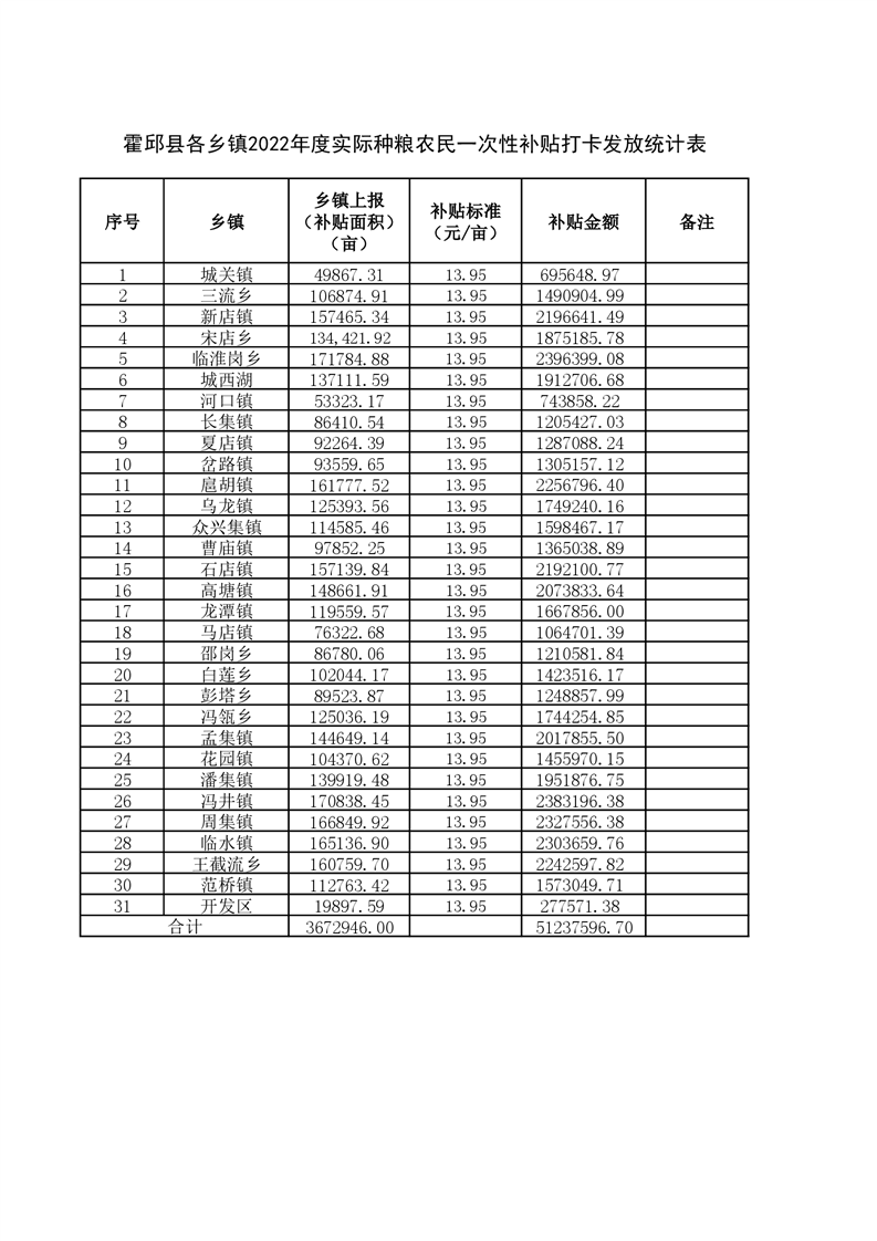 霍邱县各乡镇2022年度实际种粮农民一次性补贴打卡发放统计表