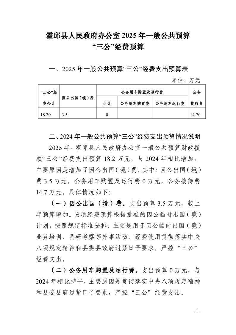 霍邱县人民政府办公室2025年一般公共预算“三公经费”预算
