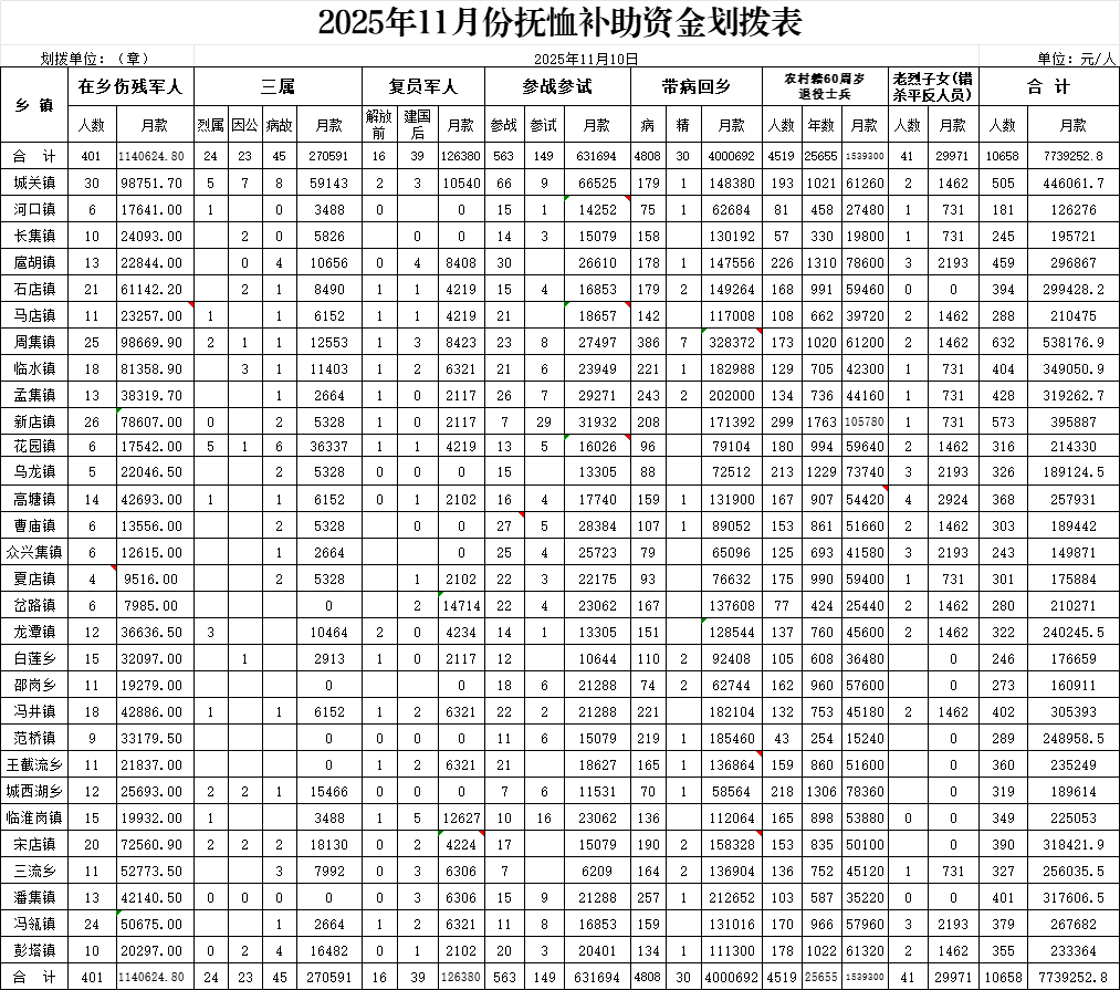 2025年11月份优抚抚恤定补款划拨表