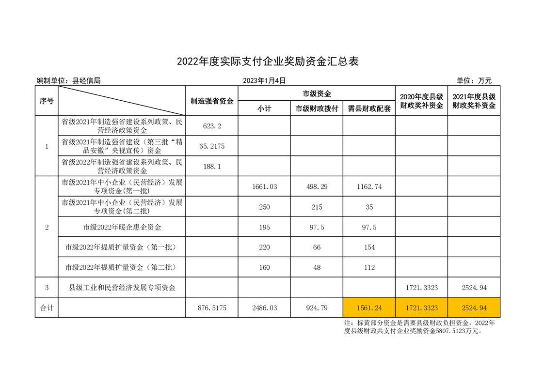 霍邱县经济和信息化局2022年实际支付企业奖励资金汇总表