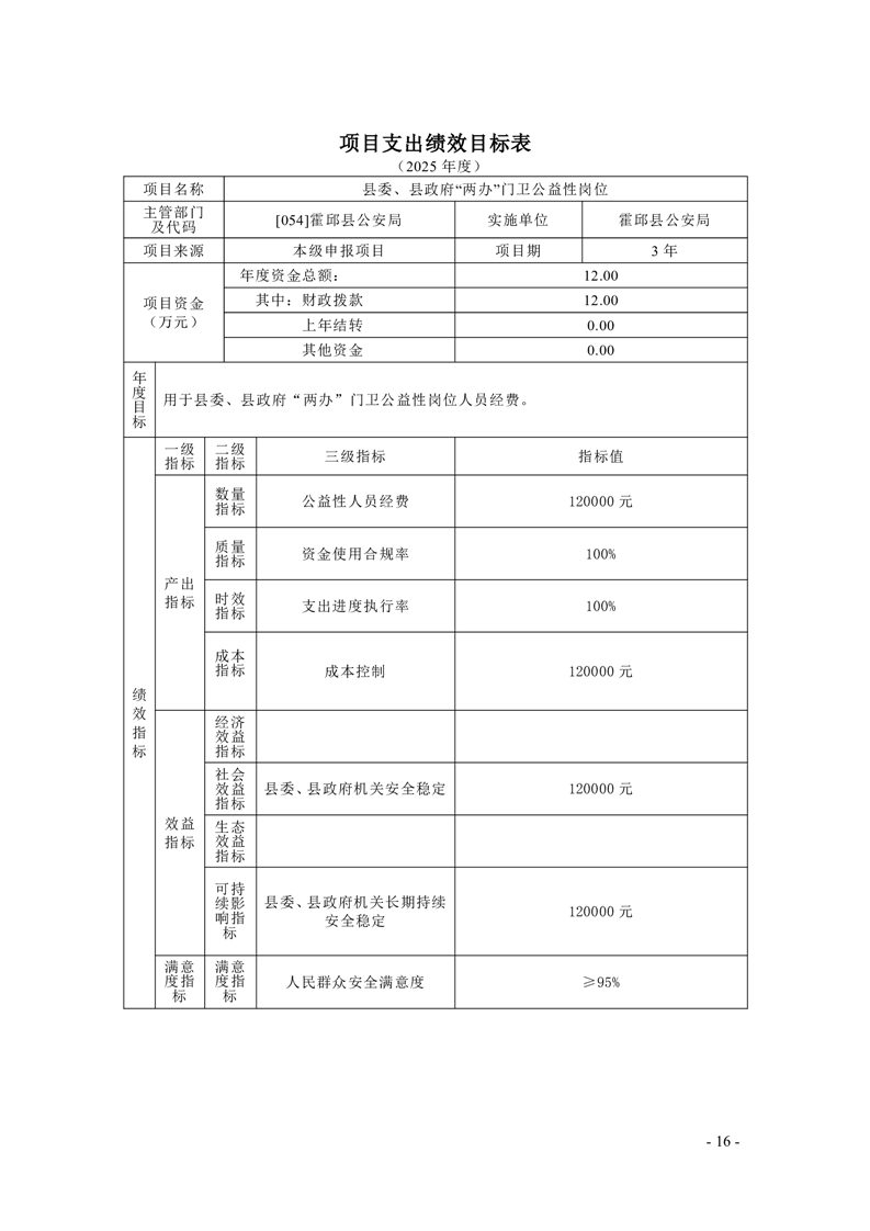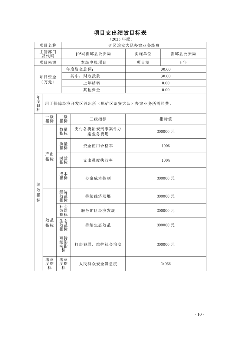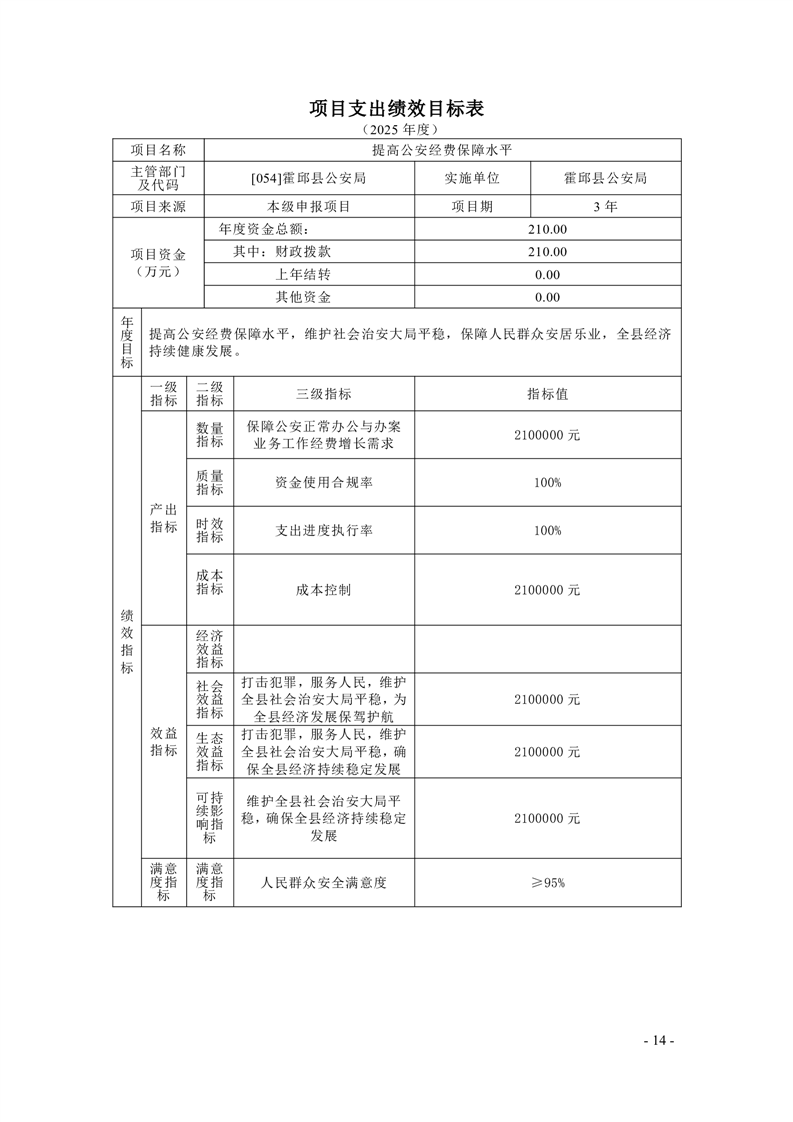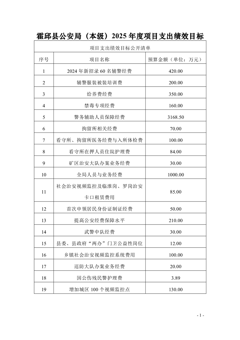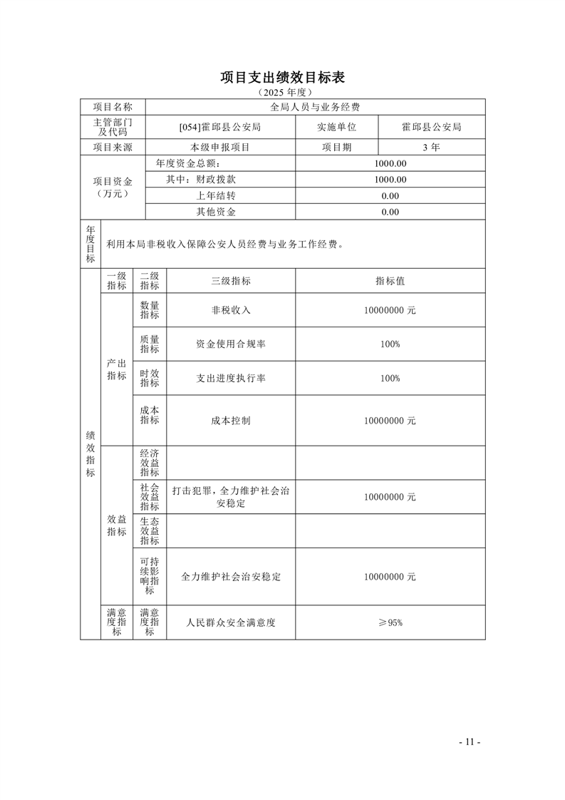 霍邱县公安局(本级)2025年单位项目支出绩效目标公开