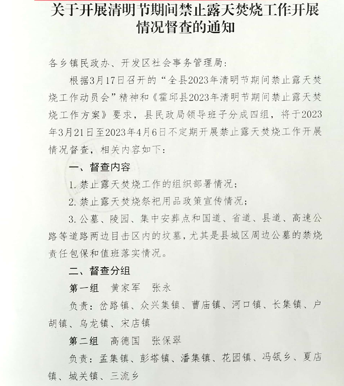 霍邱县民政局关于开展清明节期间禁止露天焚烧工作开展情况督查的通知