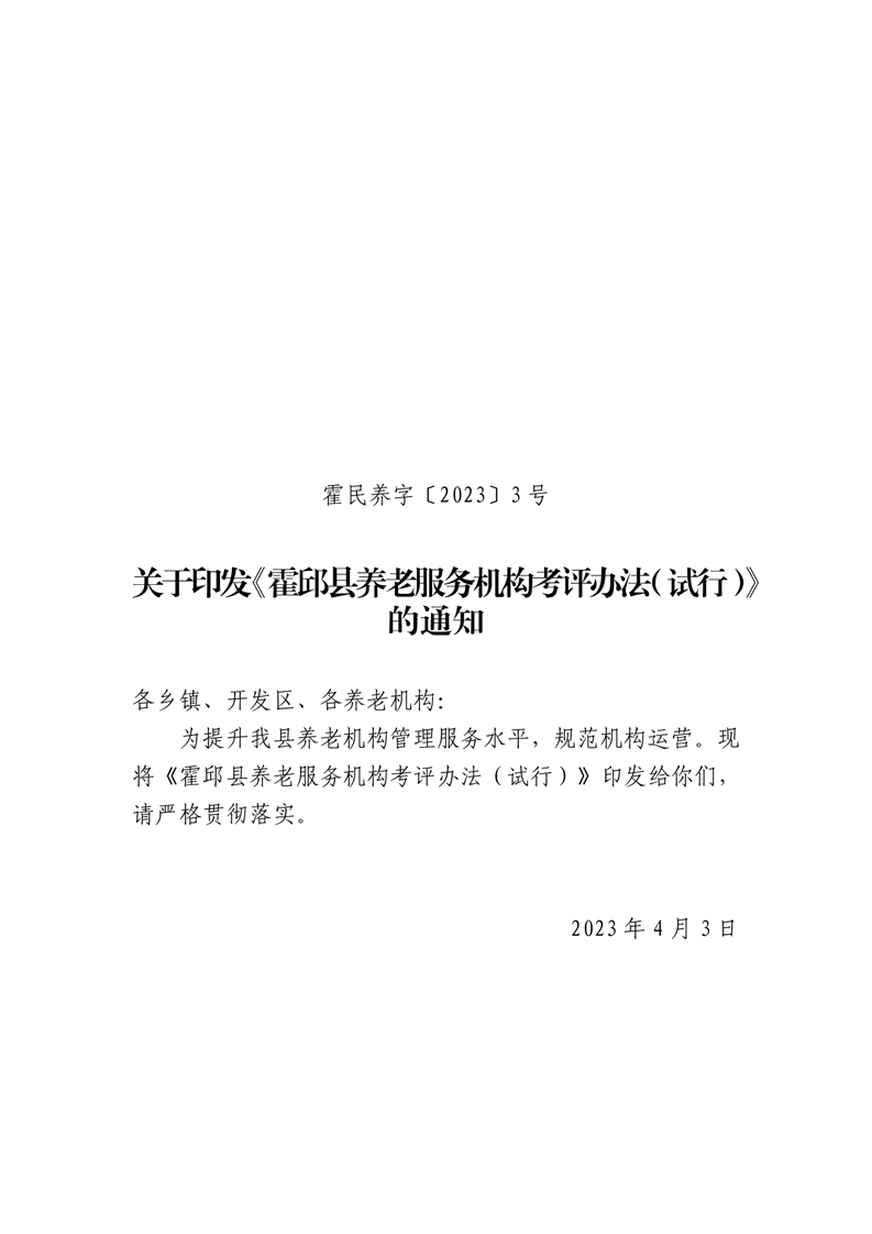 霍邱县民政局关于印发《霍邱县养老服务机构考评办法(试行)》的通知