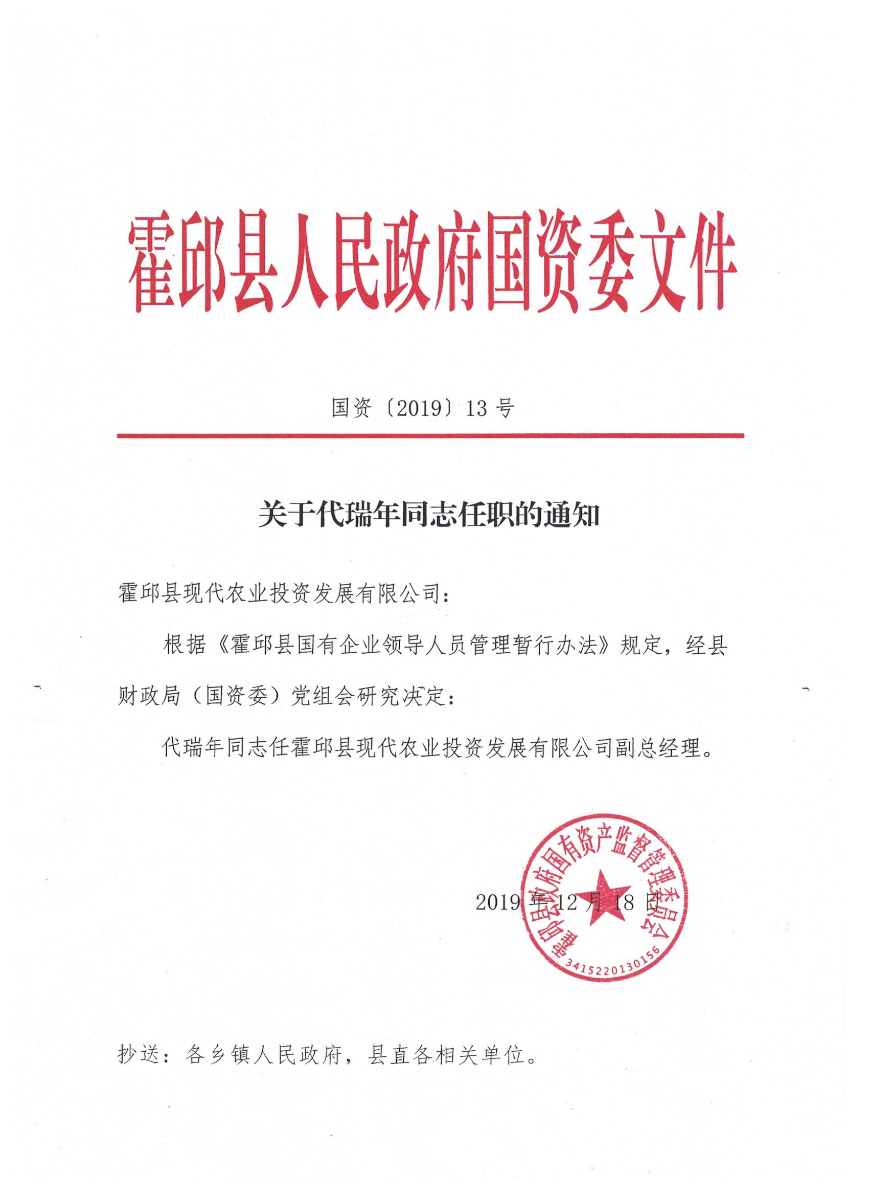 关于代瑞年同志任职的通知
