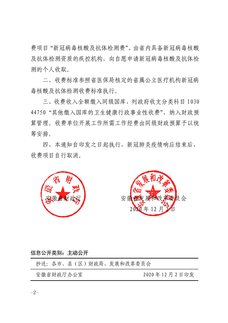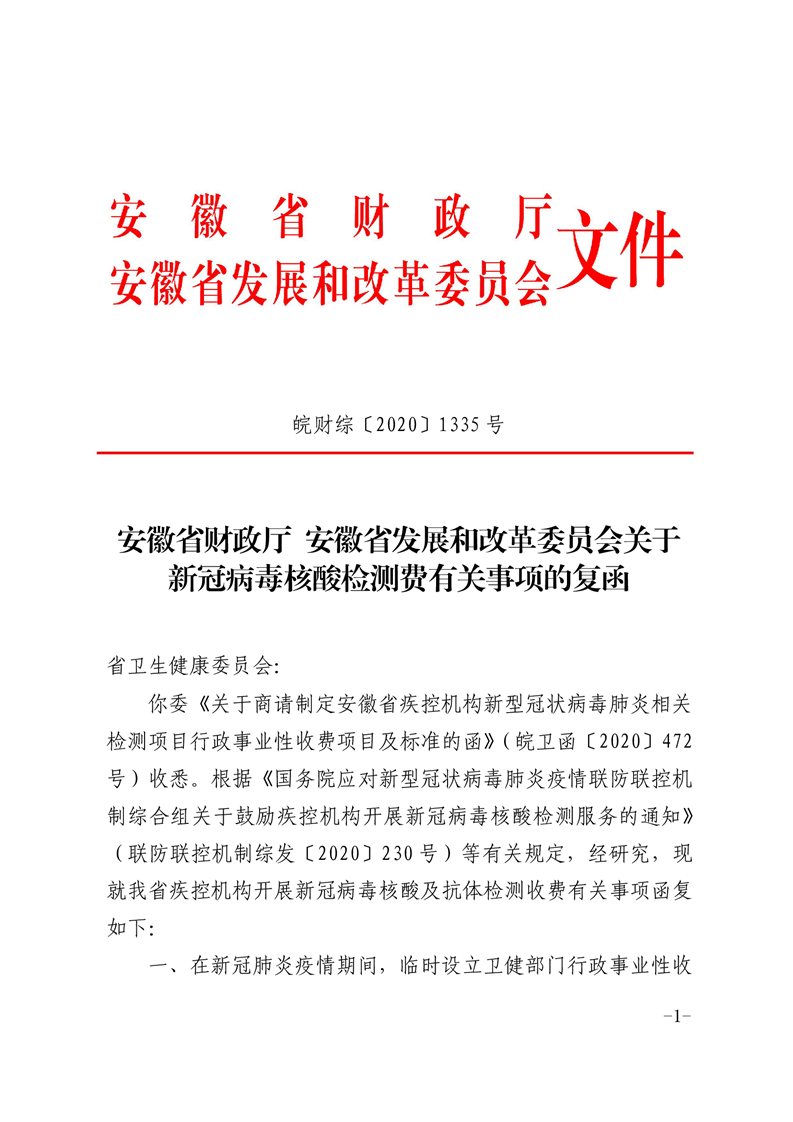 《安徽省财政厅 安徽省发展和改革委员会关于新冠病毒核酸检测费有关事项的复函 》(皖财综〔2020〕1335号)