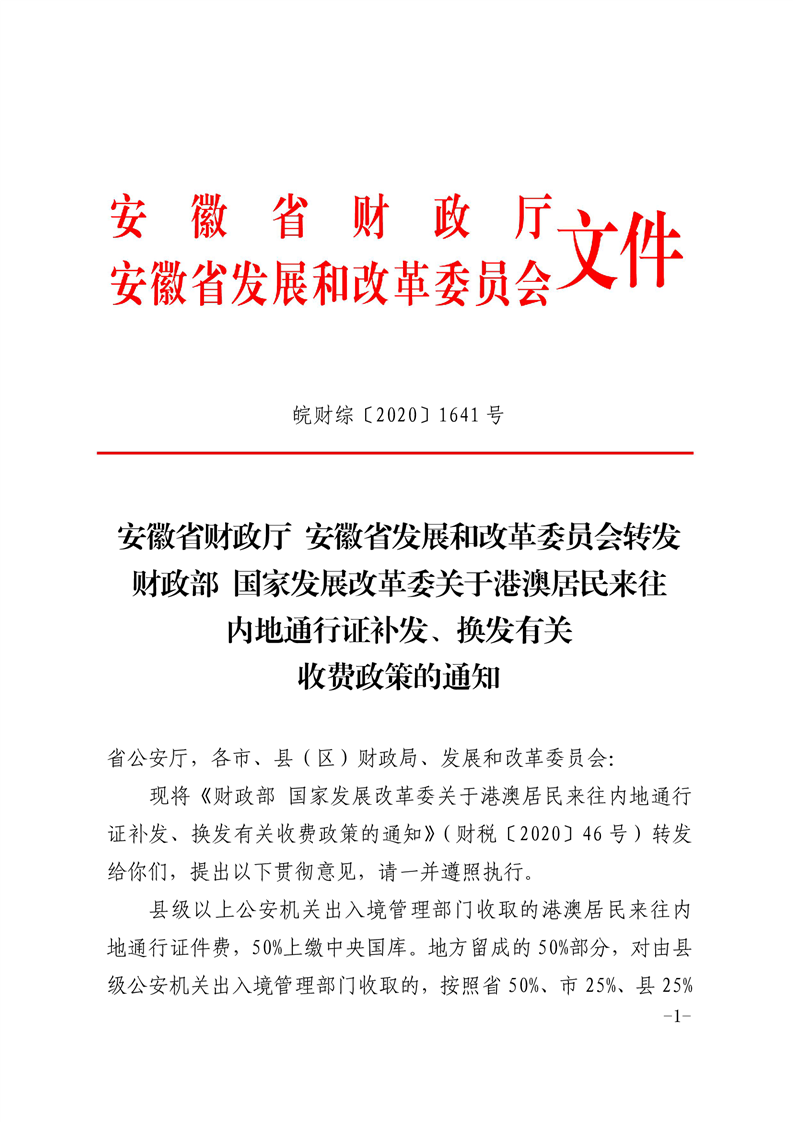 安徽省财政厅 安徽省发展和改革委员会转发财政部 国家发展改革委关于港澳居民来往内地通行证补发、换发有关收费政策的通知