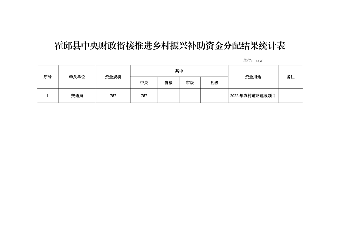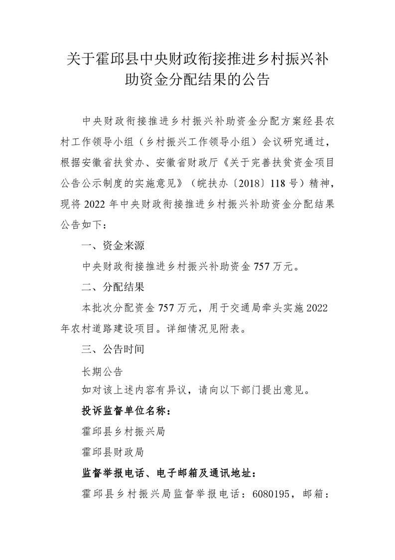 关于霍邱县中央财政衔接补助资金分配结果的公告757