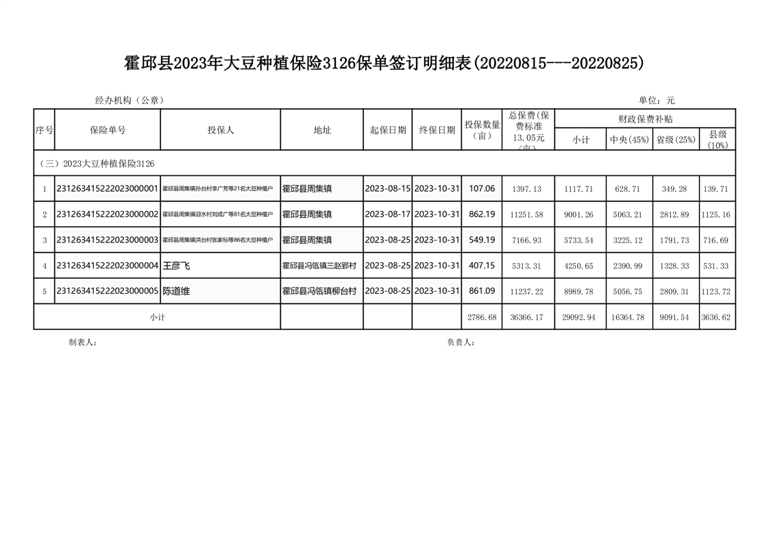 霍邱县2023年7-9月大豆投保明细表