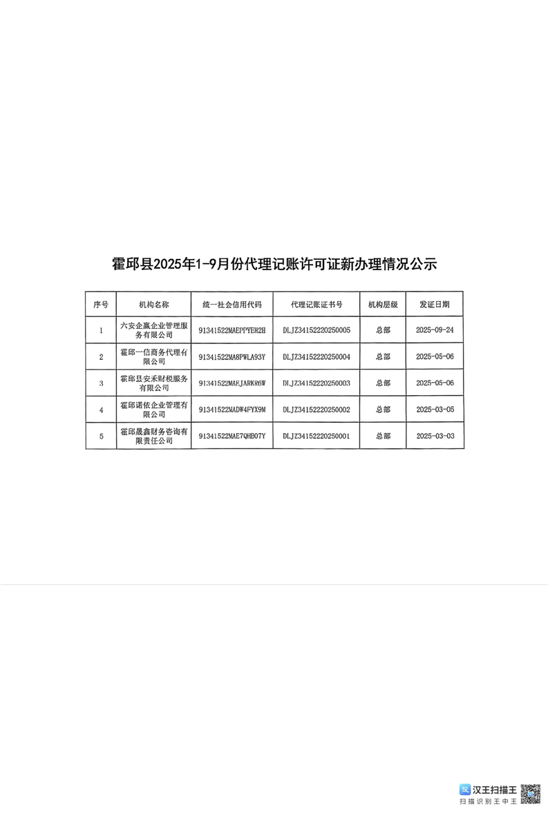 霍邱县2025年1-9月份代理记账许可证