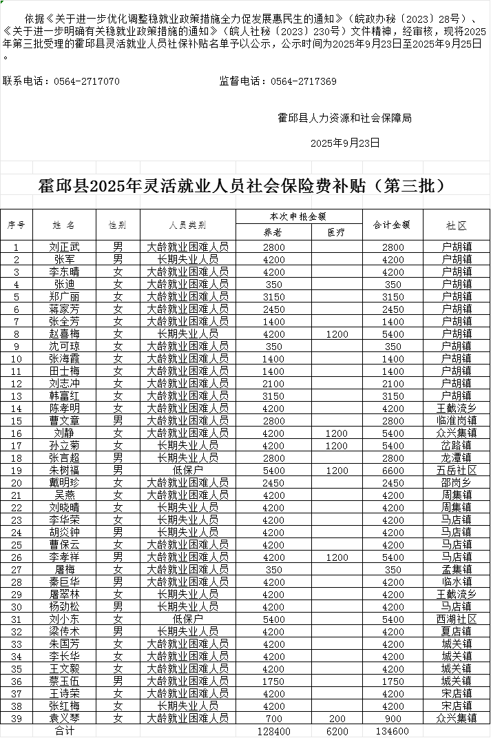 霍邱县2025年灵活就业人员社会保险费补贴(第三批)