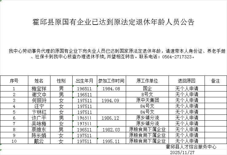 霍邱县原国有企业已达到原法定退休年龄人员公告
