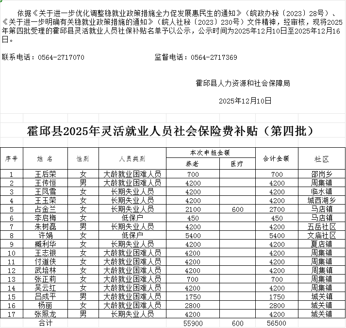 霍邱县2025年灵活就业人员社会保险费补贴(第四批)公示