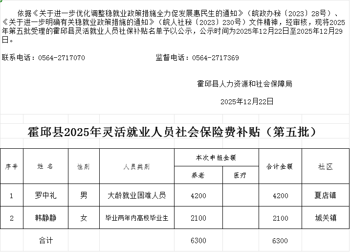 霍邱县2025年灵活就业人员社会保险费补贴(第五批)公示