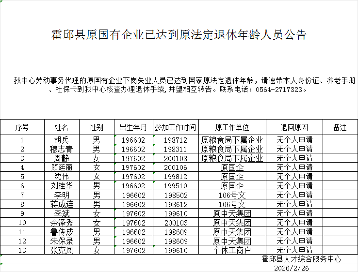 霍邱县原国有企业已达到原法定退休年龄人员公告