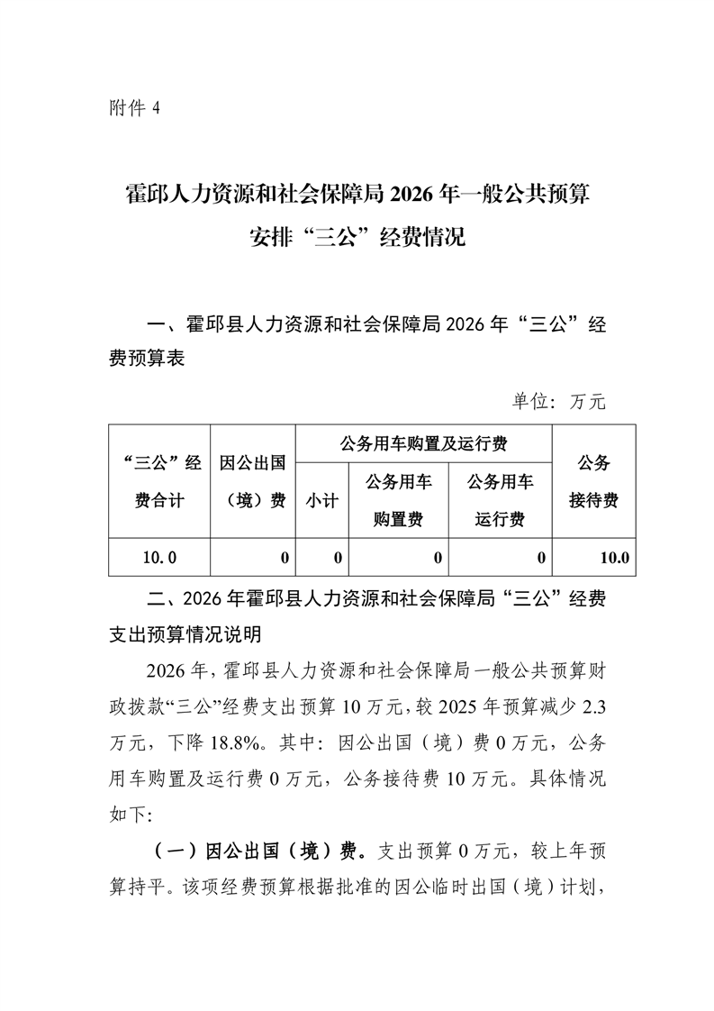 霍邱县人力资源和社会保障局2026年部门一般公共预算安排“三公”经费情况公开