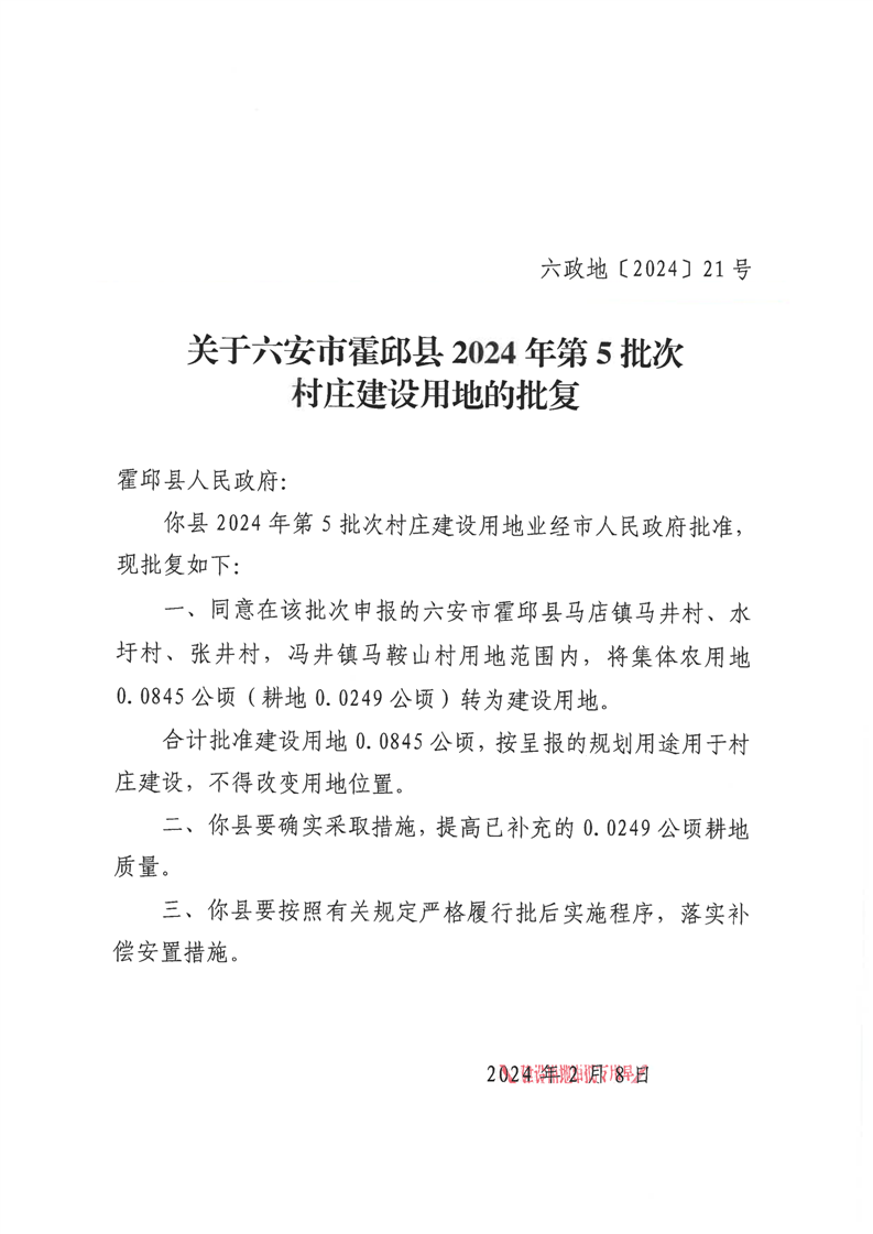 关于六安市霍邱县2024年第5批次集镇和村庄建设用地的批复