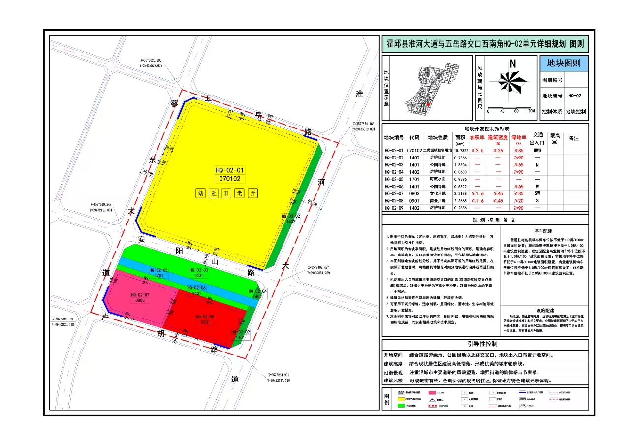 一、项目概况:该地块位于霍邱县县城区开发边界内,淮河大道与五岳路交口西南侧,分为九个小地块。详细规划面积为304.5亩。主要用地性质为:文化用地、商业用地、防护绿地、公园绿地、河流水面。