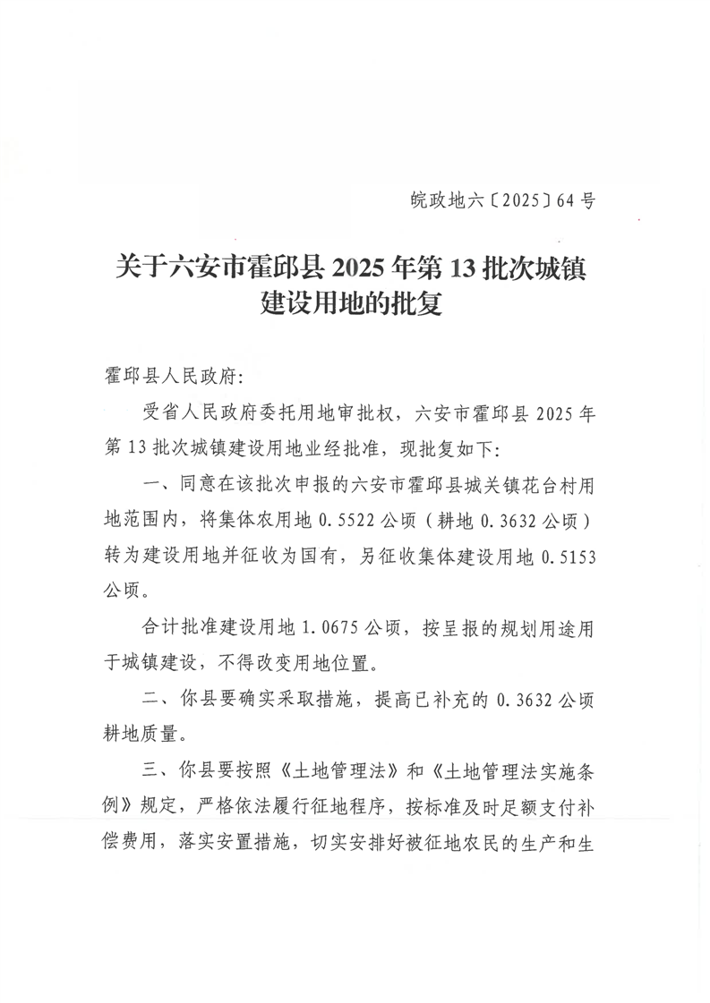 关于六安市霍邱县2025年第13批次城镇建设用地的批复