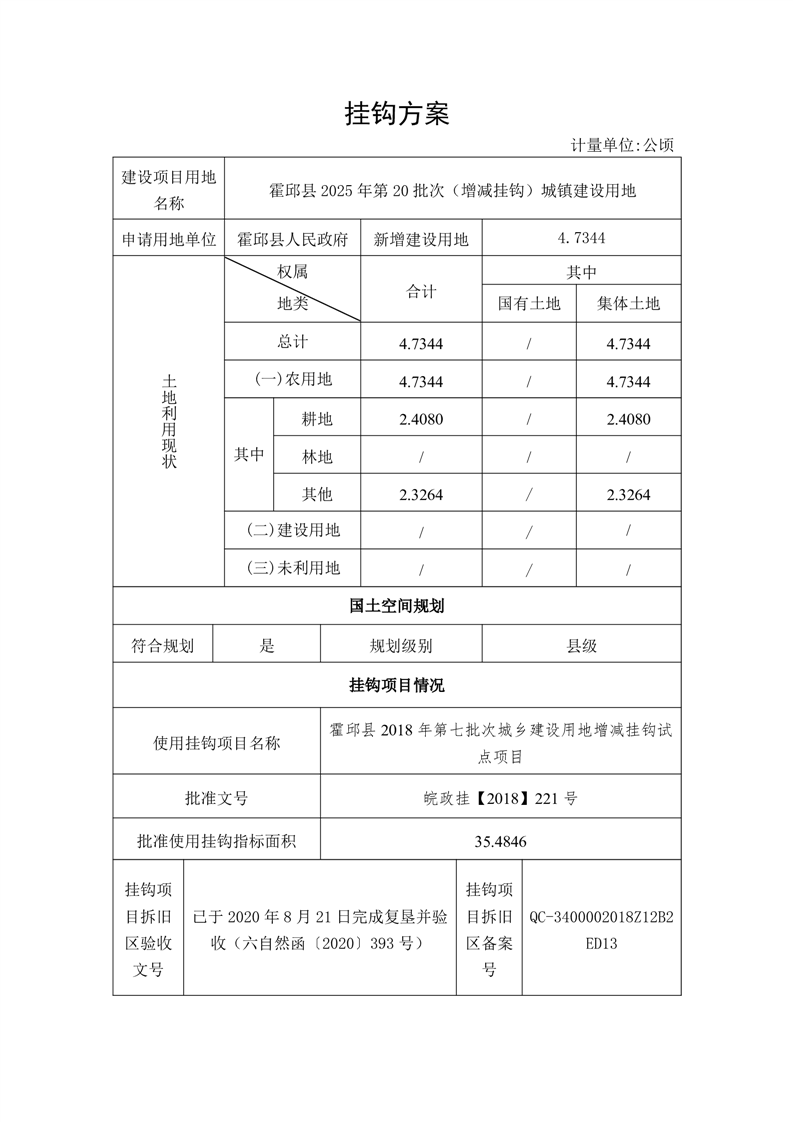霍邱县2025年第20批次(增减挂钩)城镇建设用地(农转用方案)