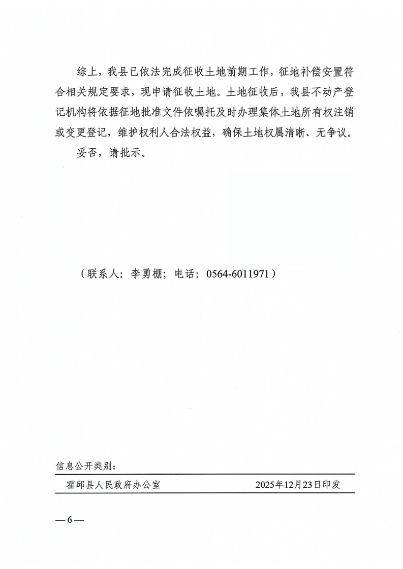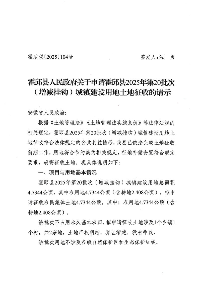 霍邱县人民政府关于申请霍邱县2025年第20批次(增减挂钩)城镇建设用地土地征收的请示