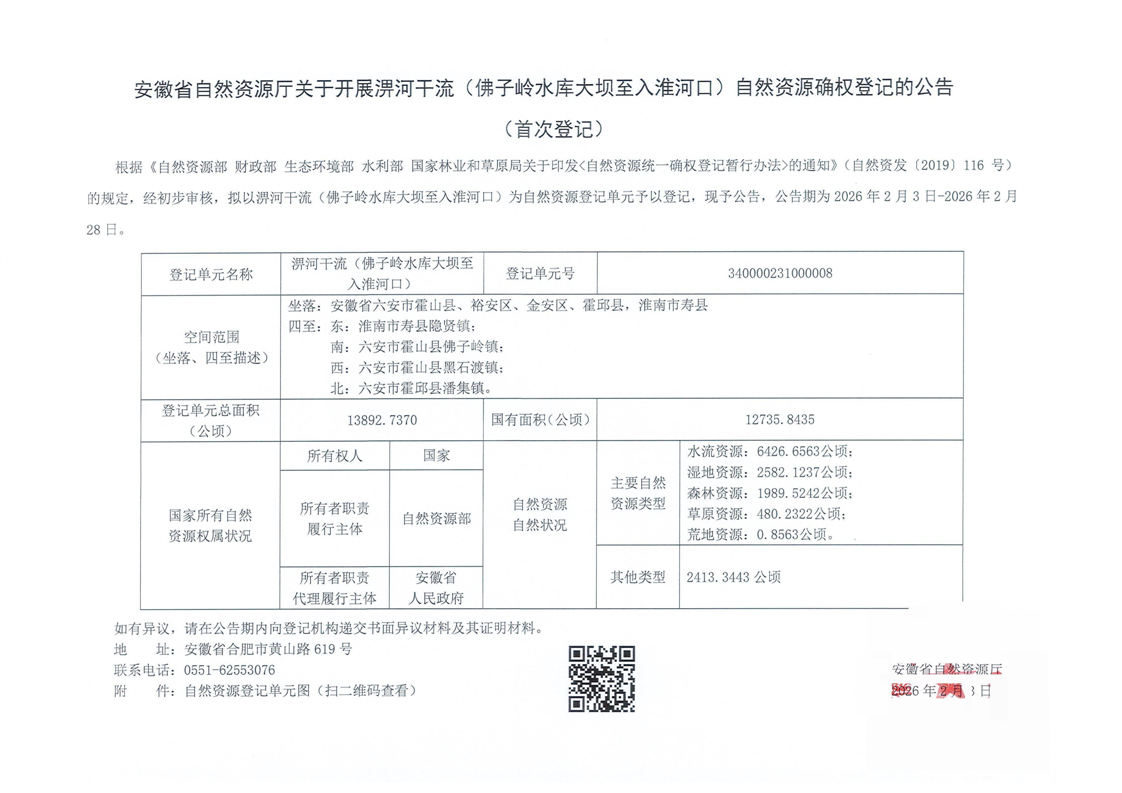 安徽省自然资源厅关于开展淠河干流(佛子岭水库大坝至入淮河口)自然资源确权登记的公告(首次登记)