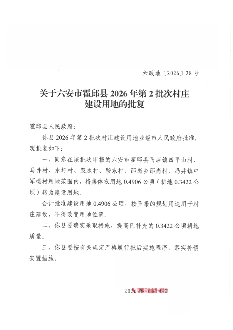关于六安市霍邱县2026年第2批次村庄建设用地的批复