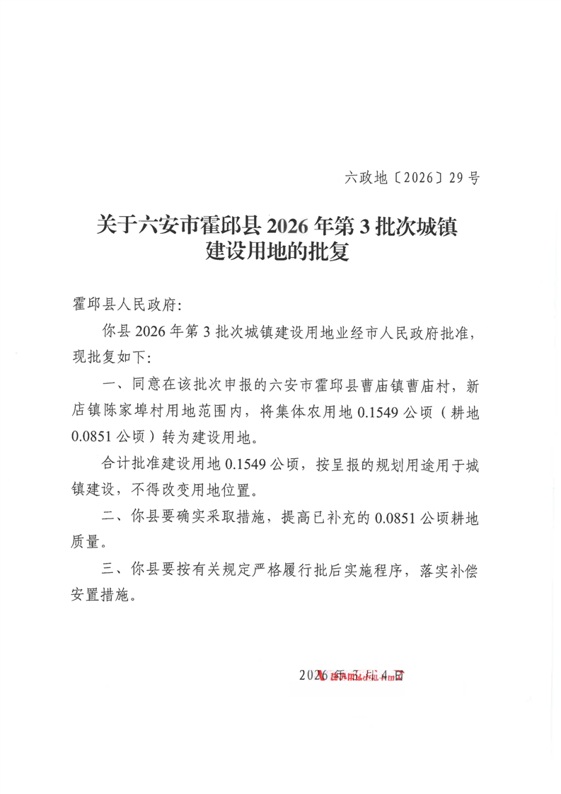 关于六安市霍邱县2026年第3批次城镇建设用地的批复