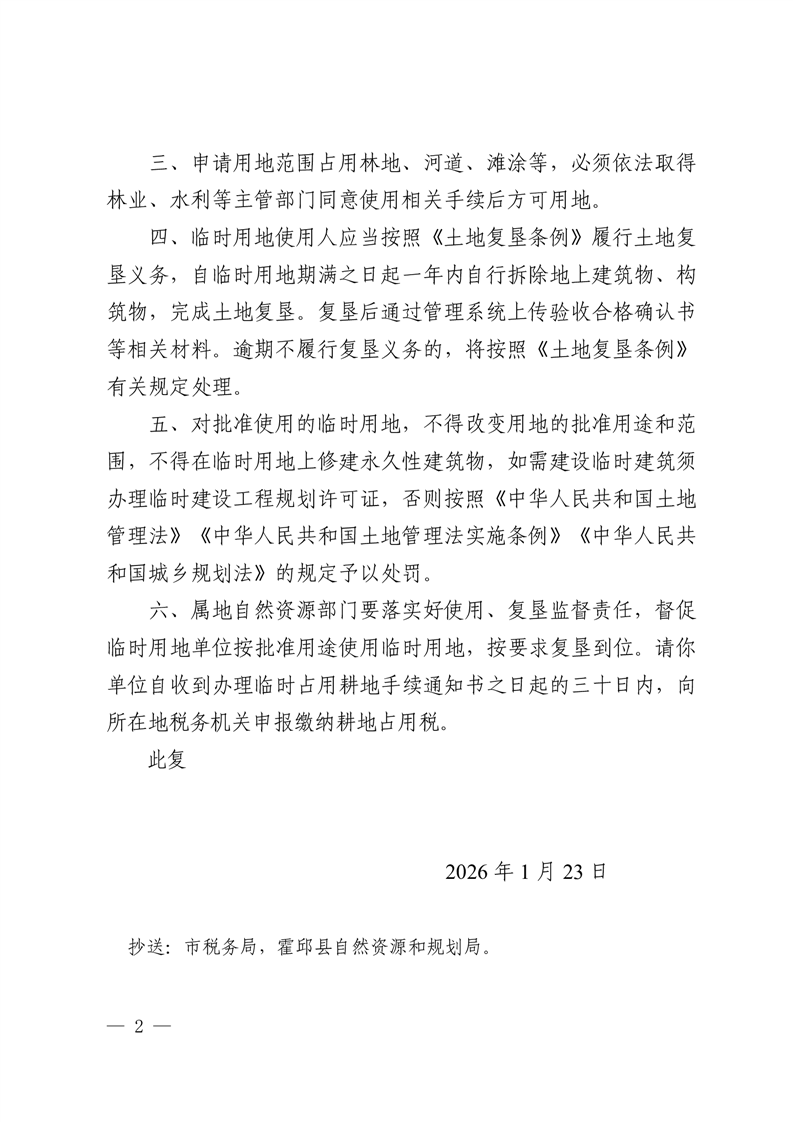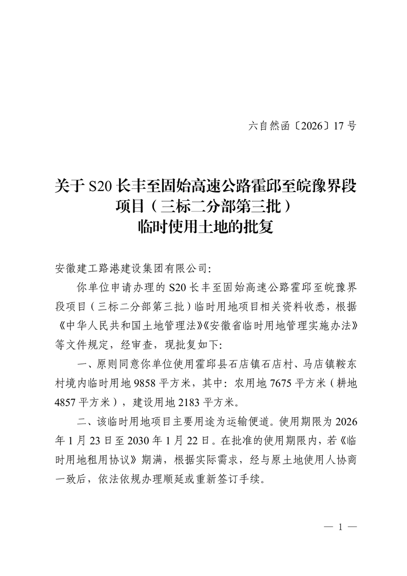 关于 S20 长丰至固始高速公路霍邱至皖豫界段项目(三标二分部第三批)临时使用土地的批复