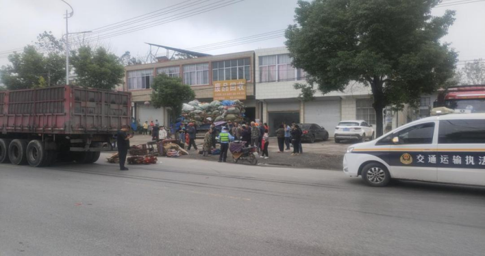 9时35分左右,执法人员路过老105国道白庙街道,发现一辆冀牌大货车拖着长长的黑色刹车痕迹停在马路中间,右边散落一些捆着的纸盒,路上还有斑斑血迹,路边一辆侧翻的三轮车,旁边许多围观的群众。巡查人员立即把执法车辆停在大货车后方五十米处,打开警示灯摆放警示标志提醒后方来车注意避让,防止二次事故和交通堵塞。
