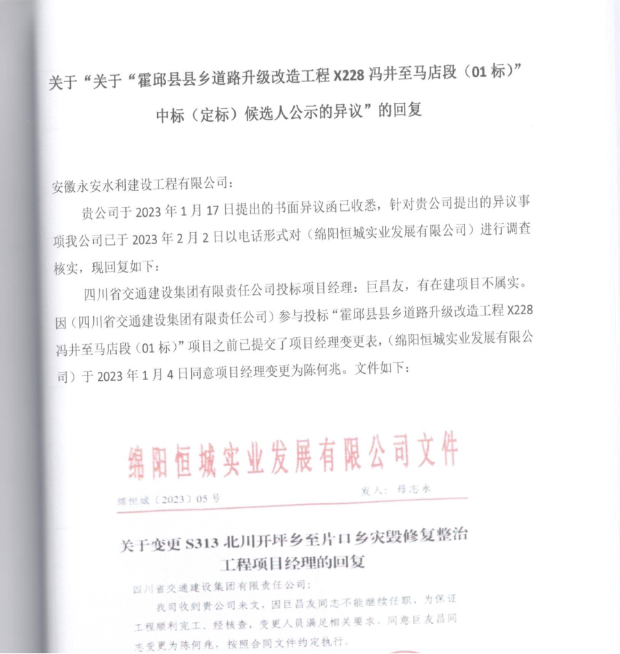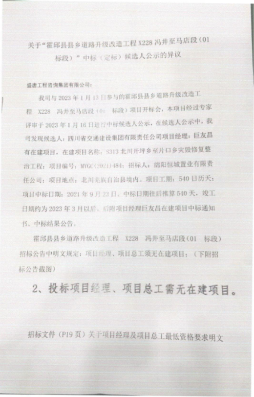【招标投标违法处罚】关于“霍邱县县乡道路升级改造工程X228 冯井至马店段(01标段)”中标(定标)候选人公示的异议