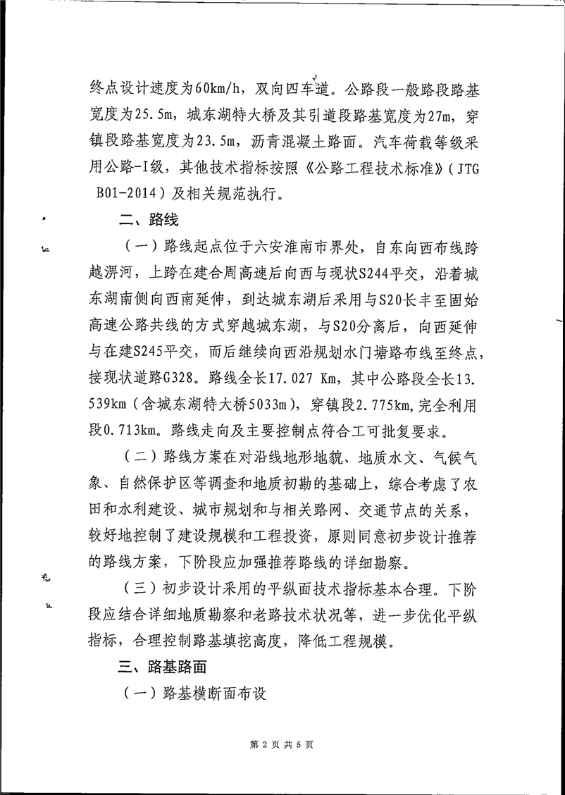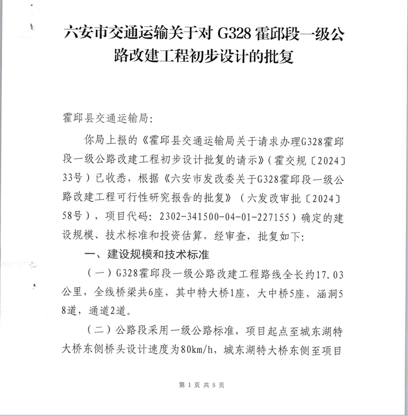 关于G328霍邱段一级公路改建工程初步设计的批复