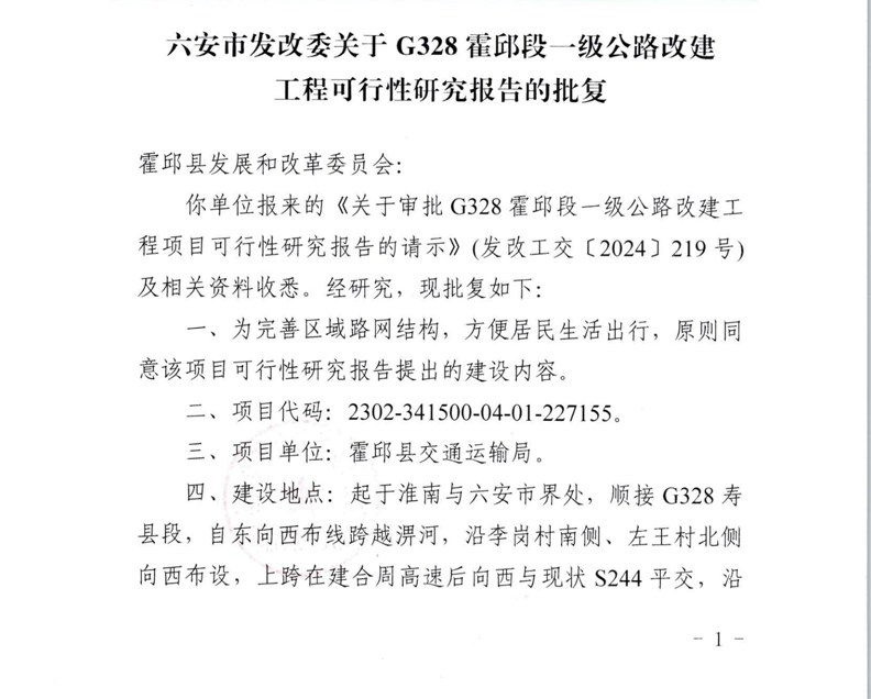 关于G328霍邱段一级公路改建工程可行性研究报告的批复