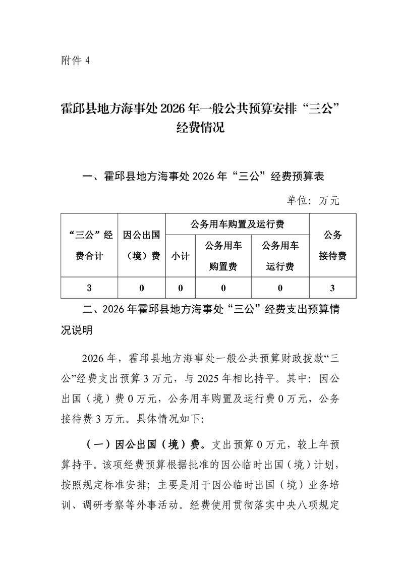 霍邱县地方海事处2026年部门单位一般公共预算安排“三公”经费情况公开