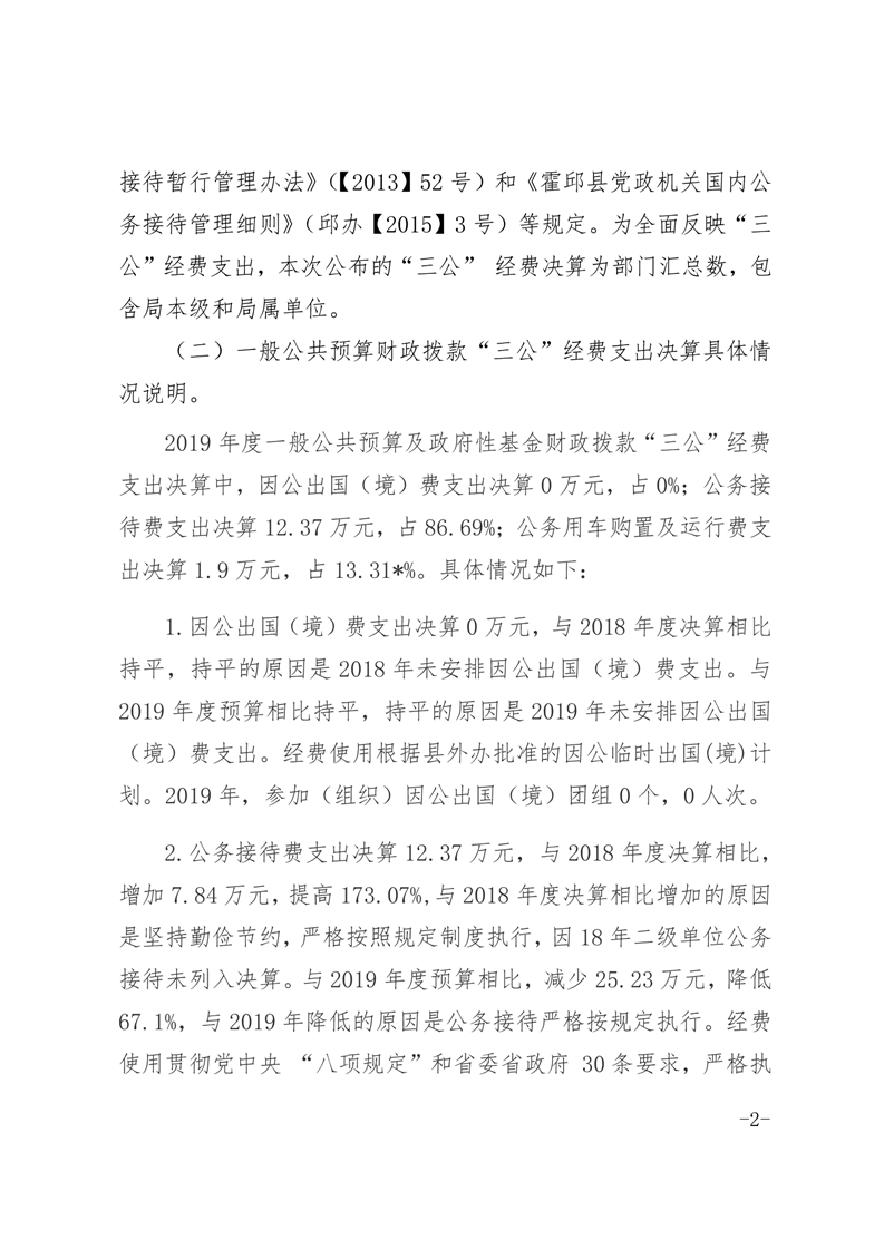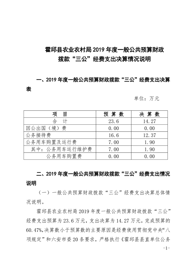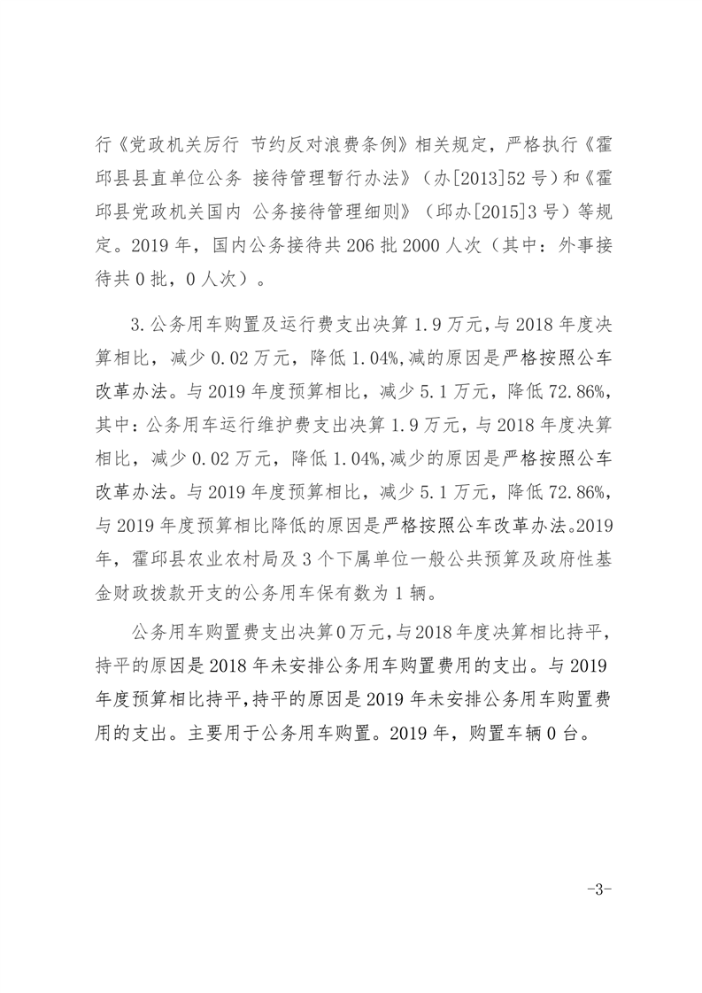 霍邱县农业农村局2019年度一般公共预算财政拨款“三公”经费支出决算