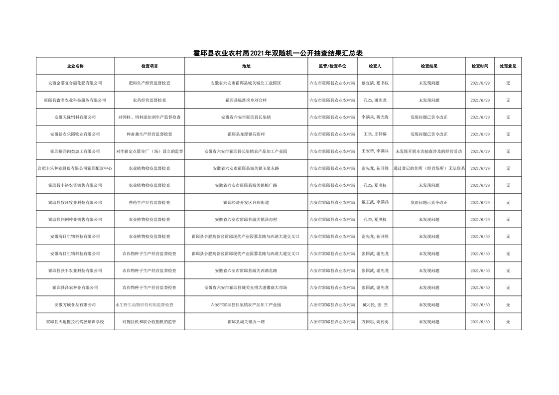 霍邱县农业农村局2021年双随机一公开抽查结果汇总表