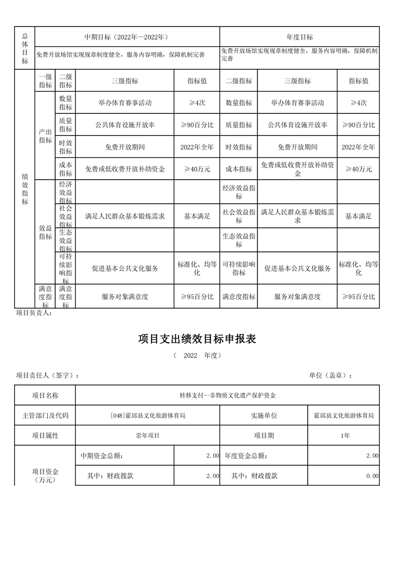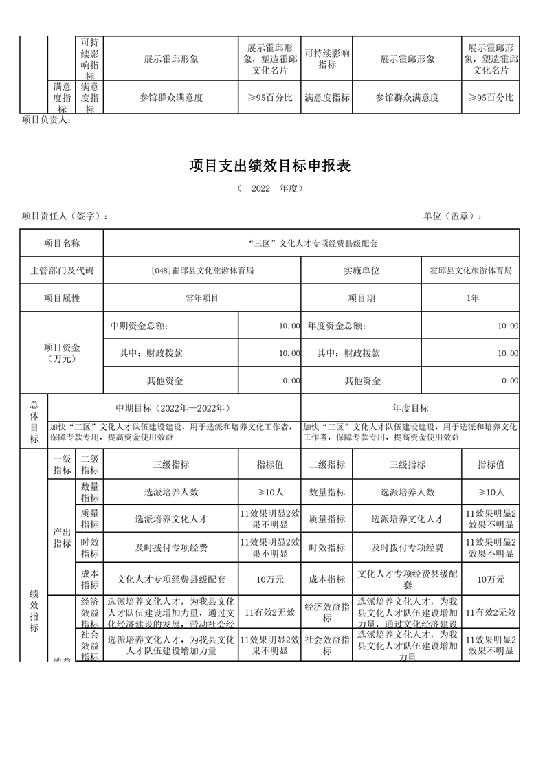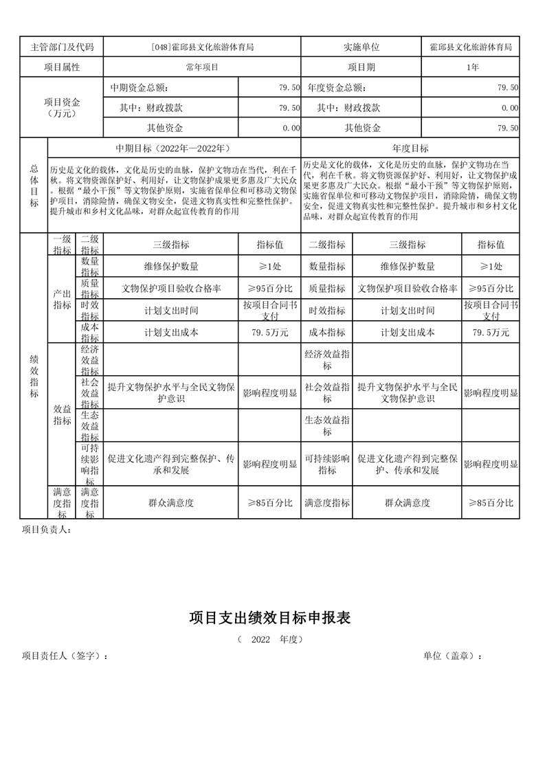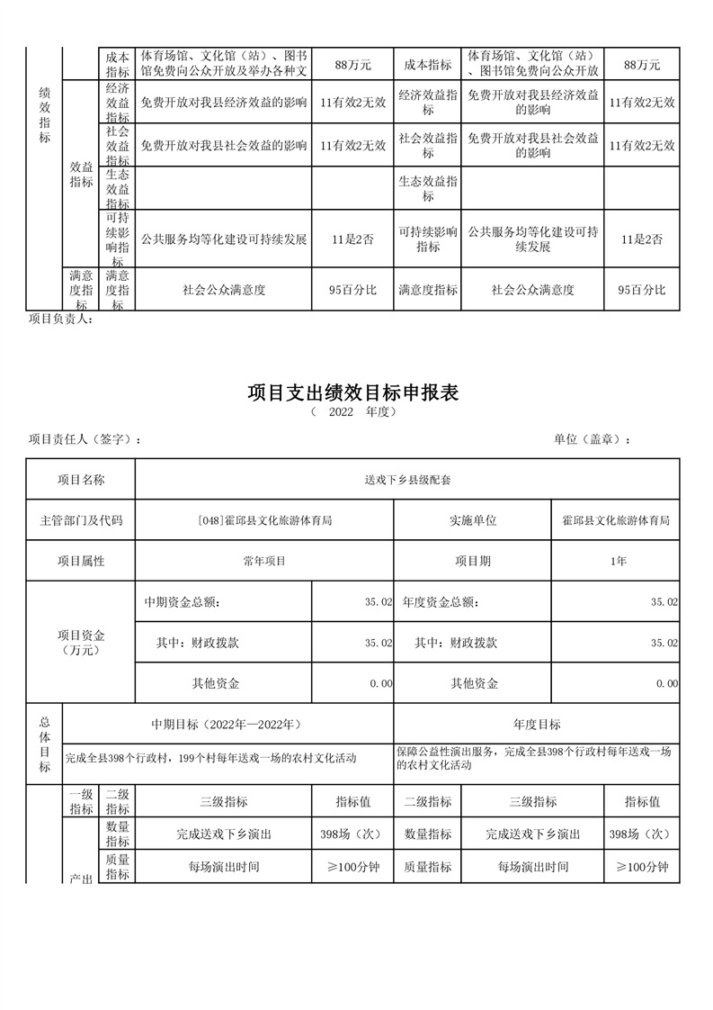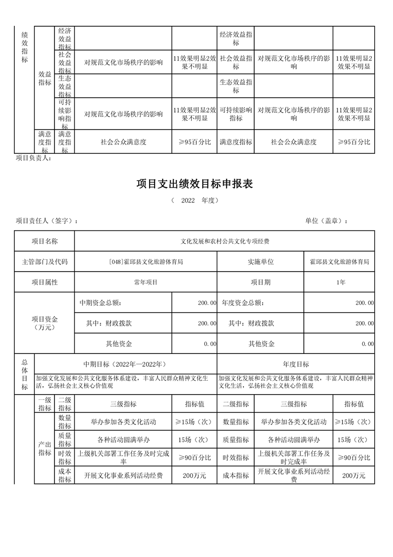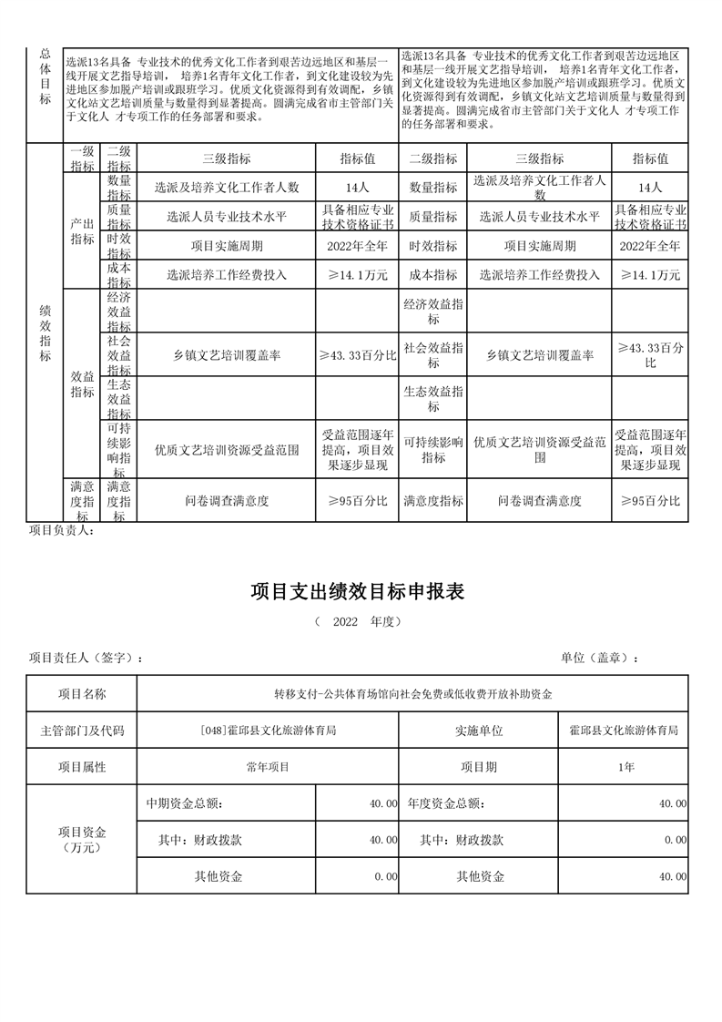 霍邱县文化旅游体育局2022年项目绩效目标表