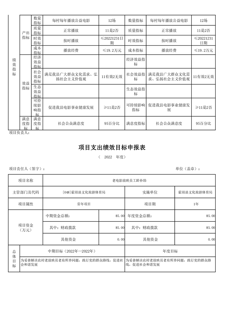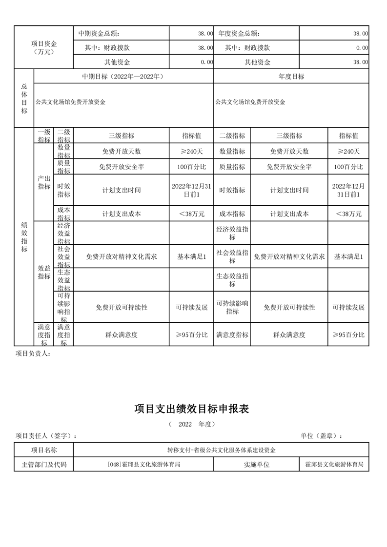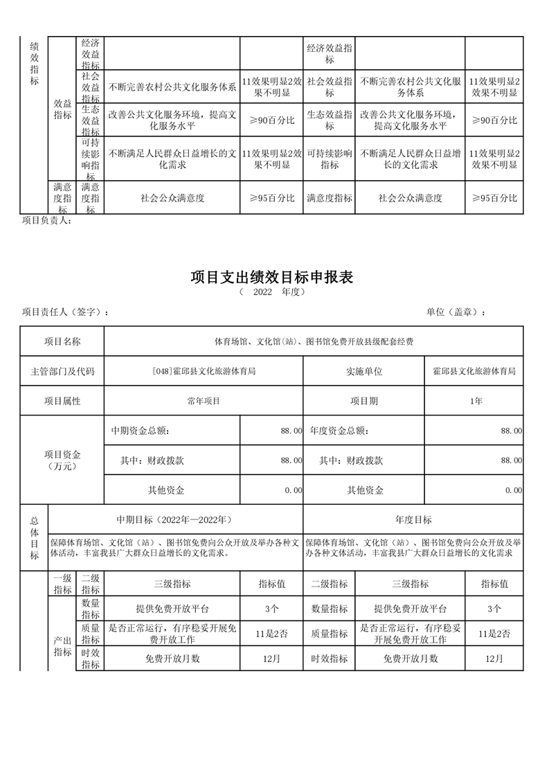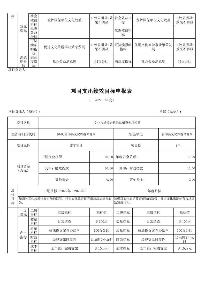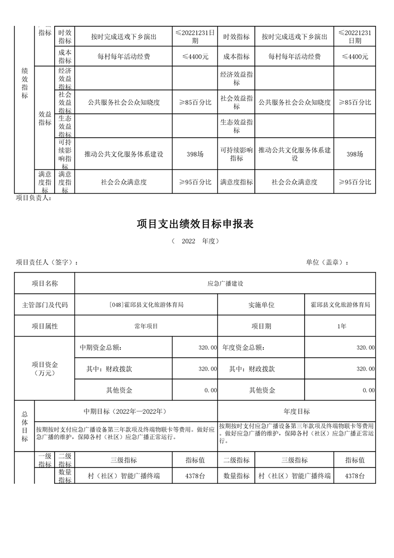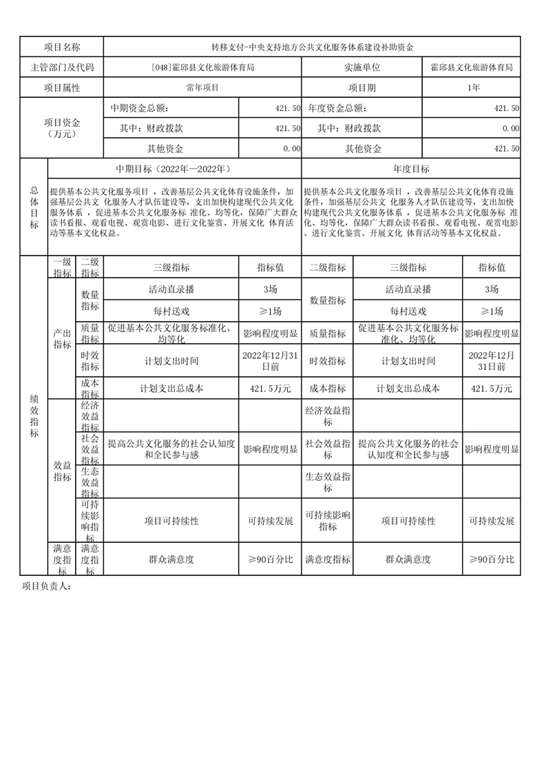 霍邱县文化旅游体育局2022年项目绩效目标表