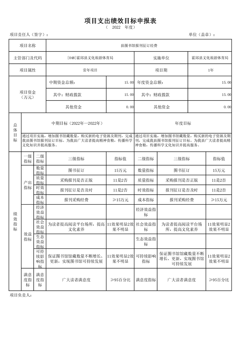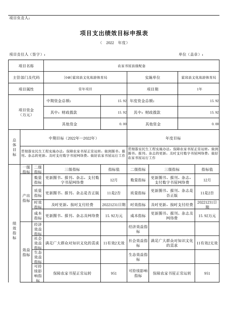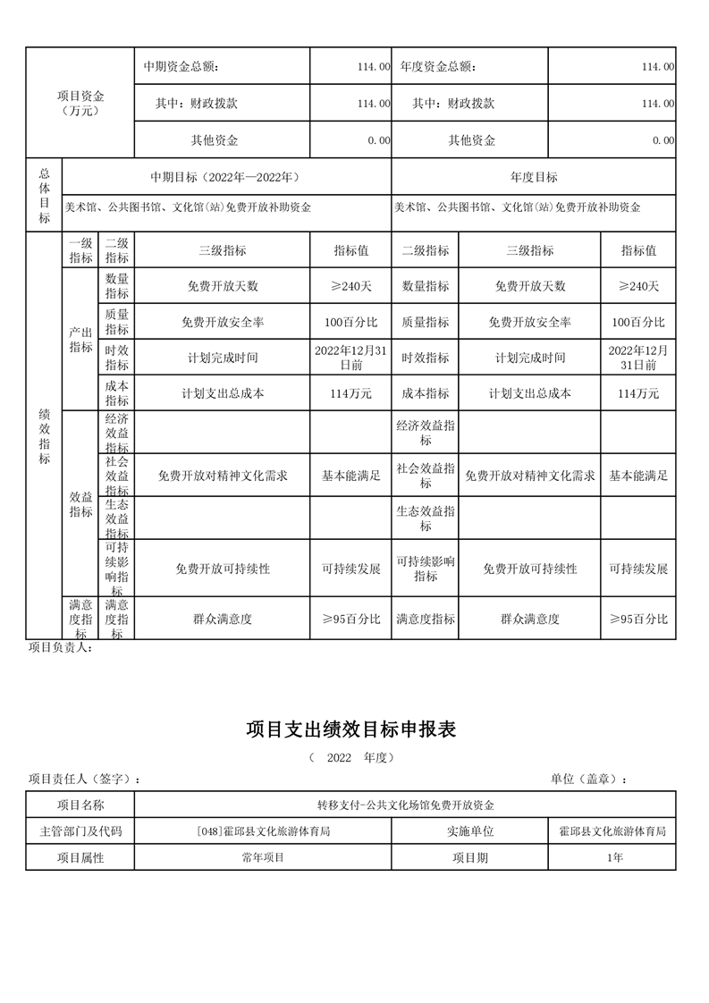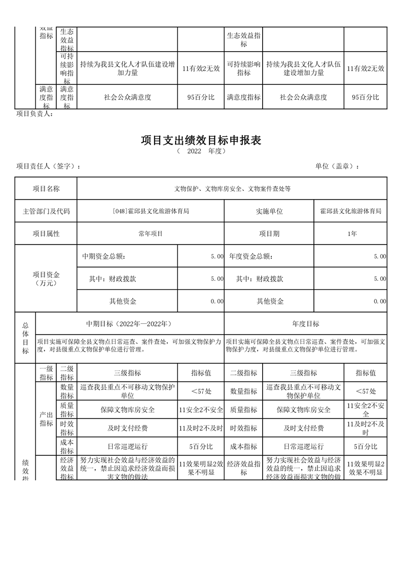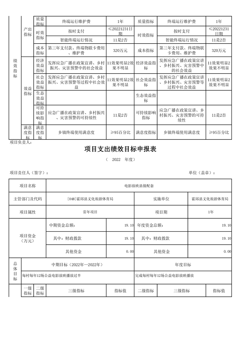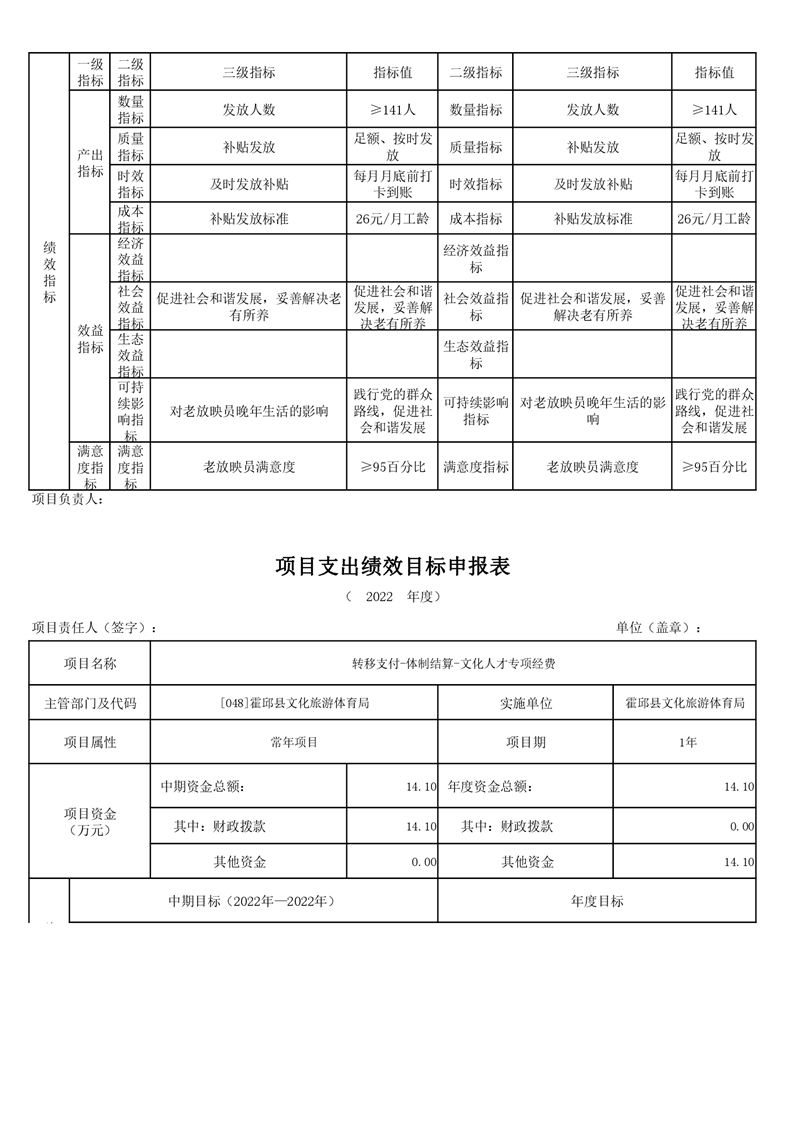 霍邱县文化旅游体育局2022年项目绩效目标表