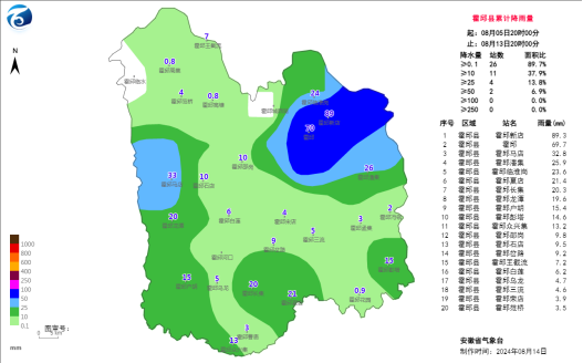 应急响应期间霍邱县降水总体呈现空间分布不均的特点。累计降雨量最大新店站89.3毫米,城关镇69.7毫米。8月6日下午至傍晚我县出现强对流天气,城关镇和新店镇出现短时强降水。