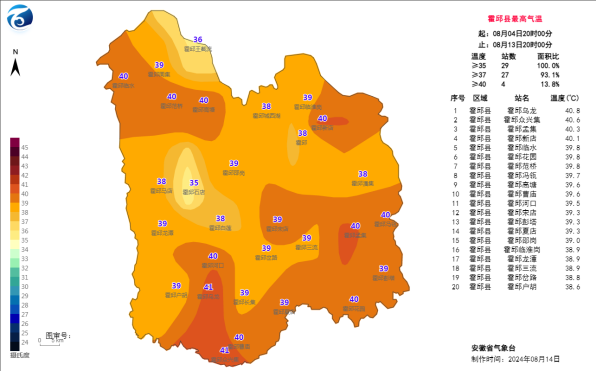 应急响应期间霍邱县大部分乡镇最高气温超过37℃,最高气温最大值出现在乌龙站40.8℃(8月10日),城关镇过程最高气温37.9℃(8月9日)。
