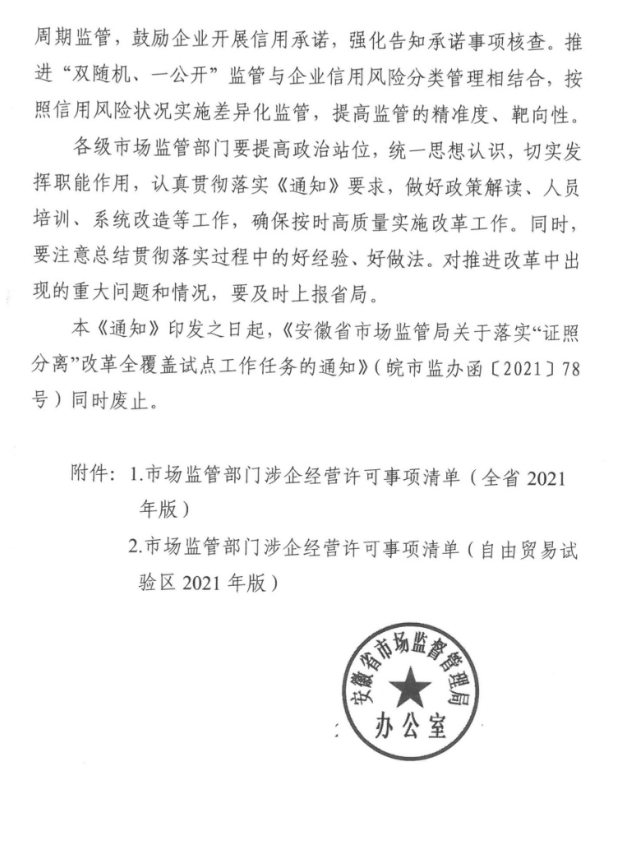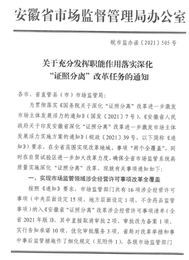 现将安徽省市场监督管理局办公室《关于充分发挥职能作用落实深化“证照分离”改革任务的通知》(皖市监办函﹝2021﹞505号)转发给你们,请认真贯彻落实。