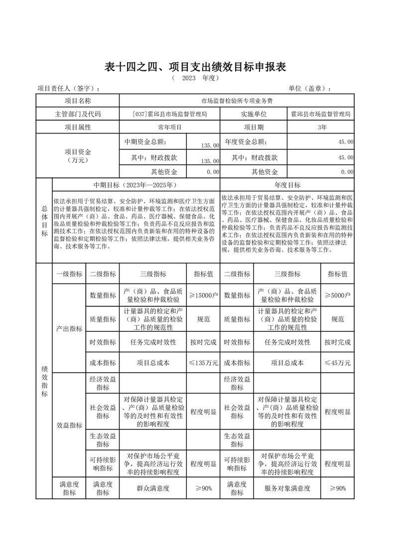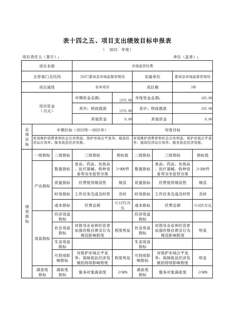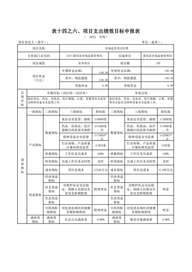 霍邱县市场监督管理局2023年项目绩效目标申报表