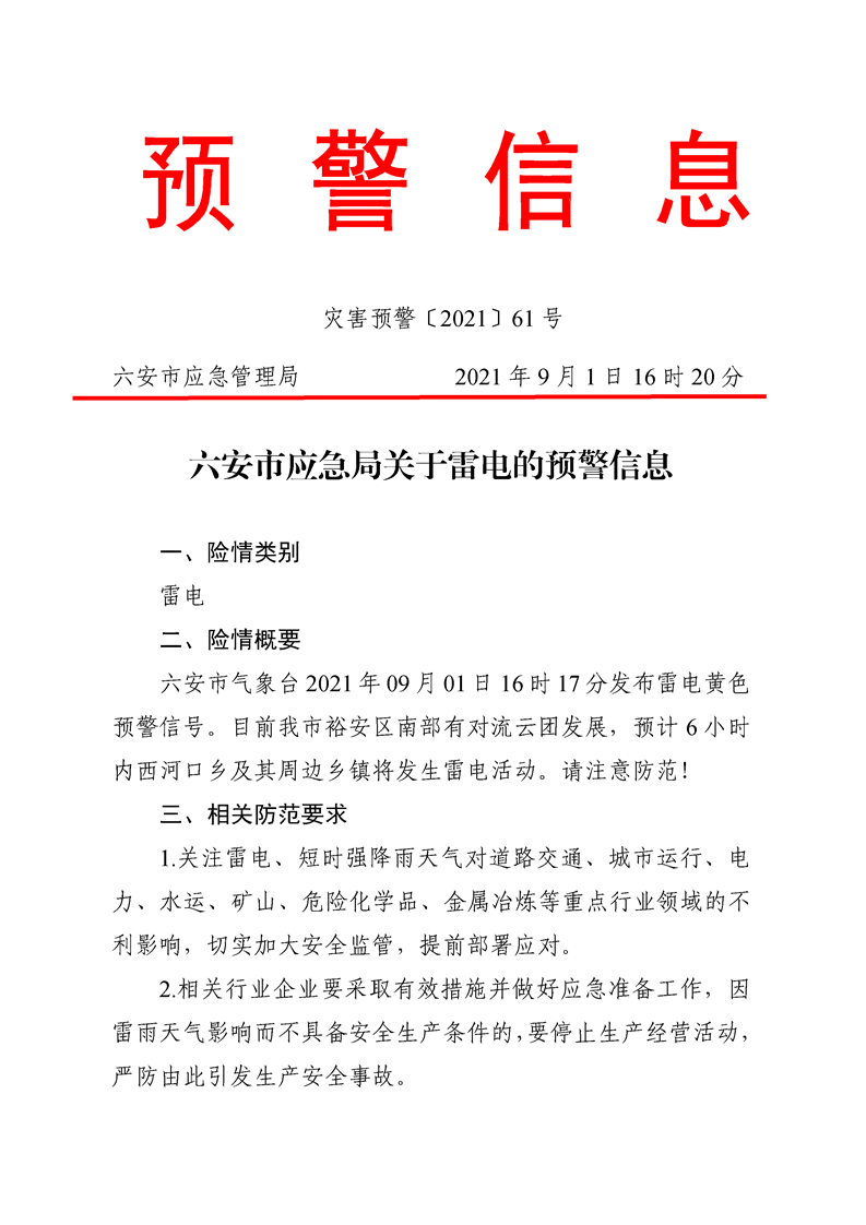 【转载】六安市应急局关于雷电的预警信息