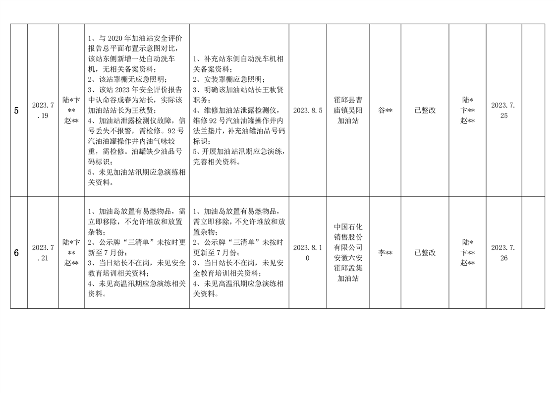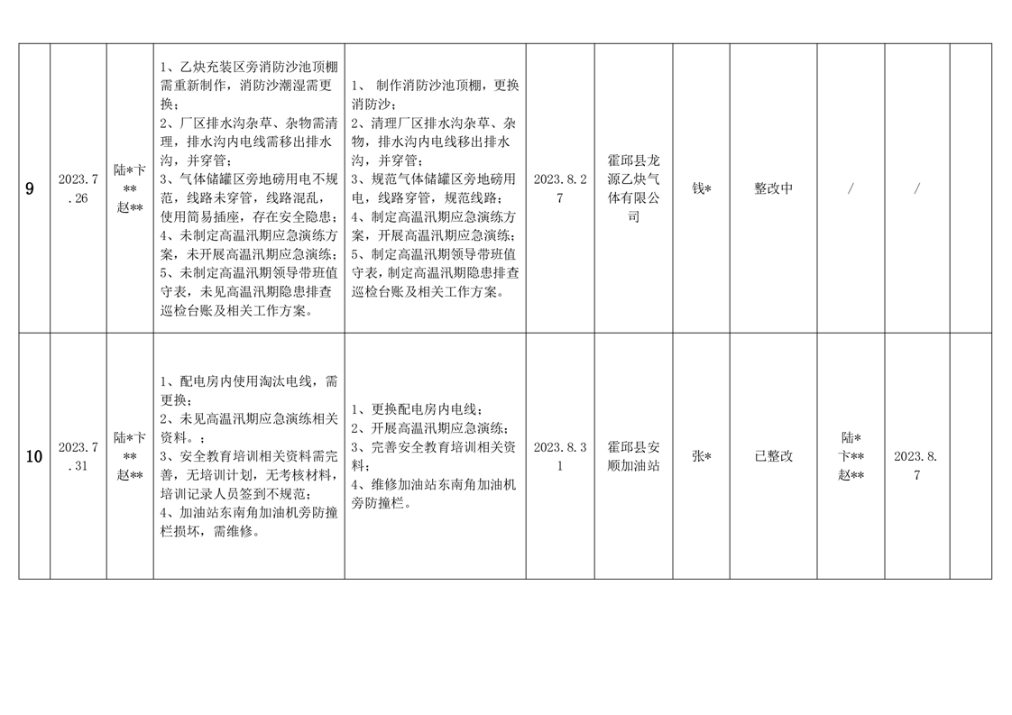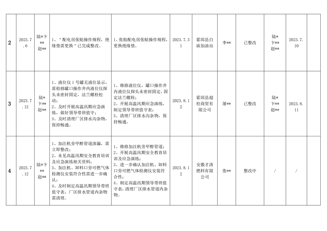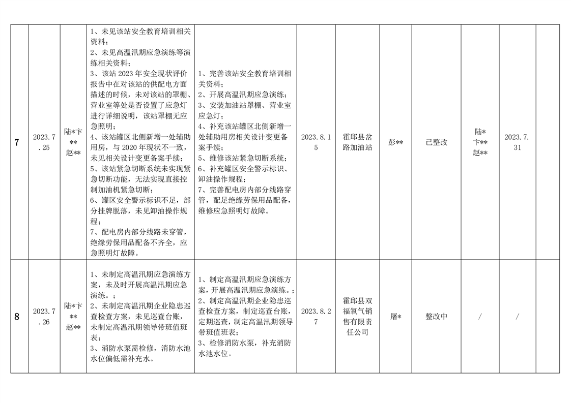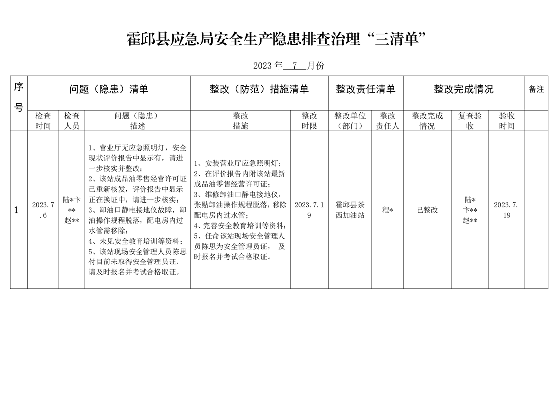 霍邱县应急管理局2023年7月隐患排查治理“三清单”