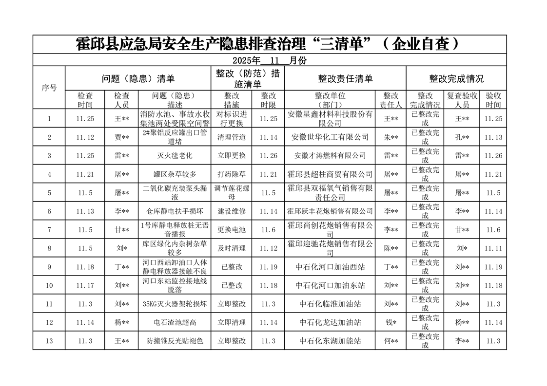 2025年霍邱县应急局安全生产隐患排查治理“三清单”(企业自查)(11月)