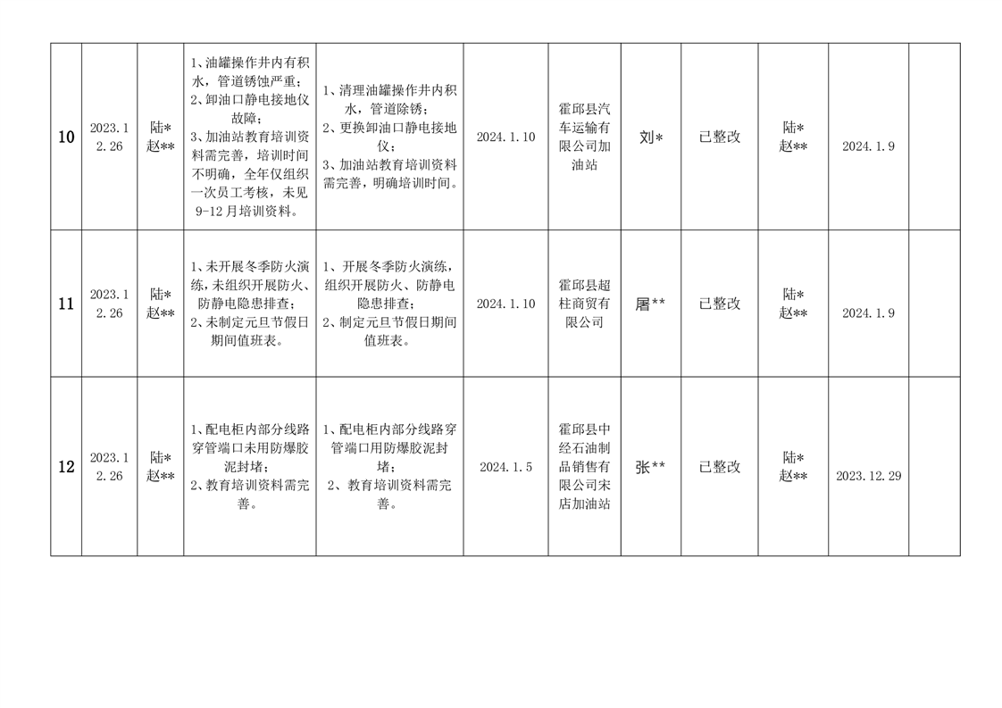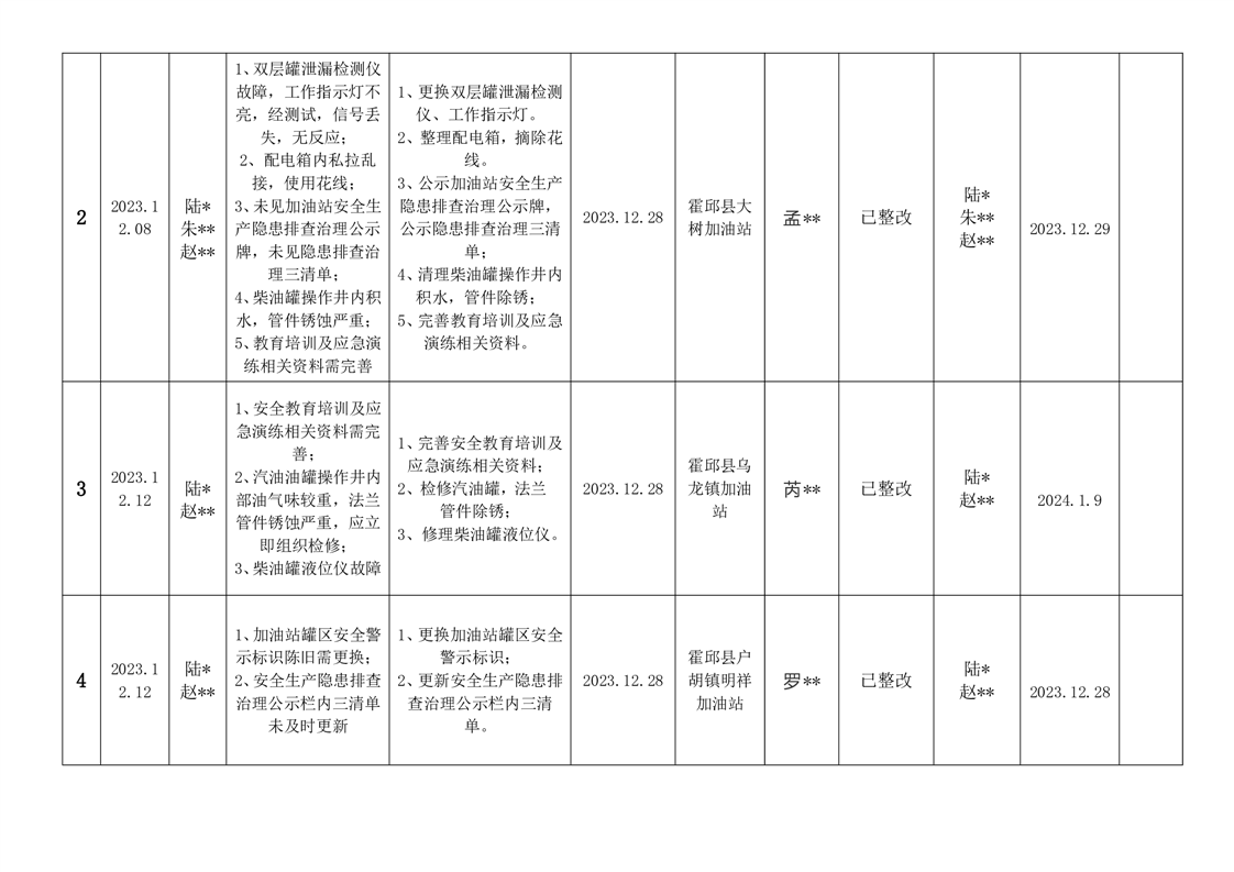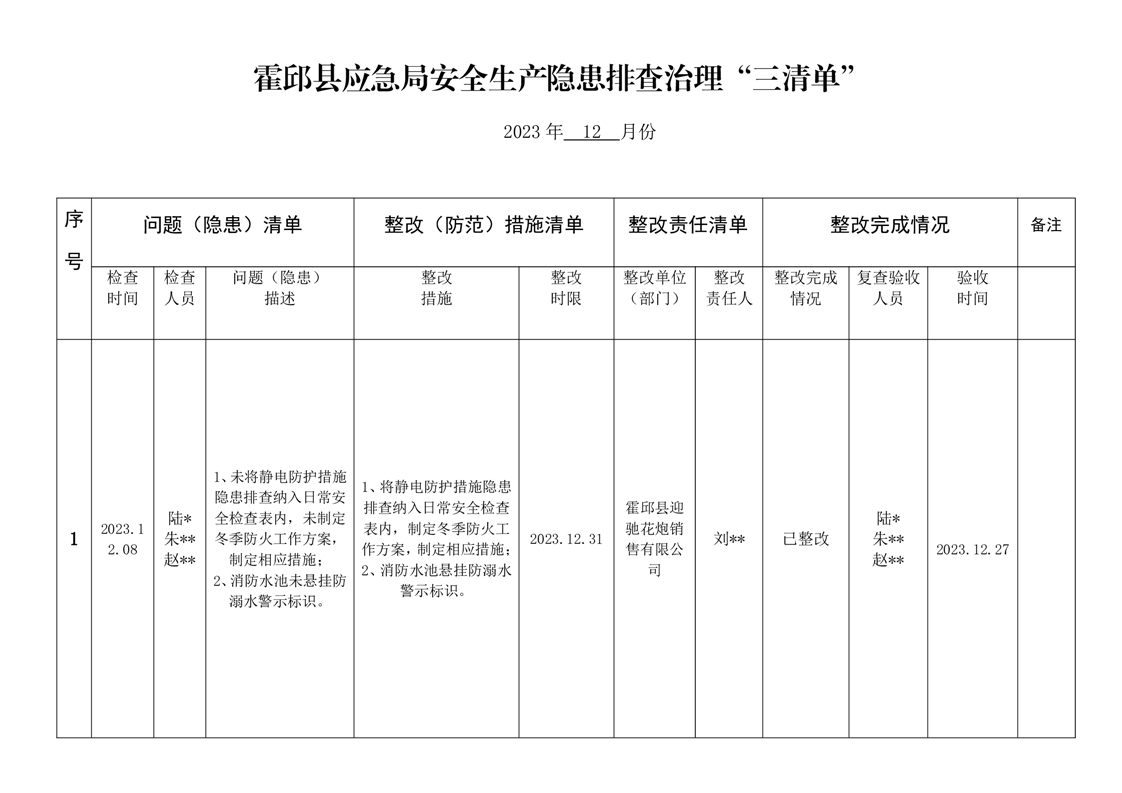 霍邱县应急管理局2023年12月安全生产隐患排查治理“三清单”