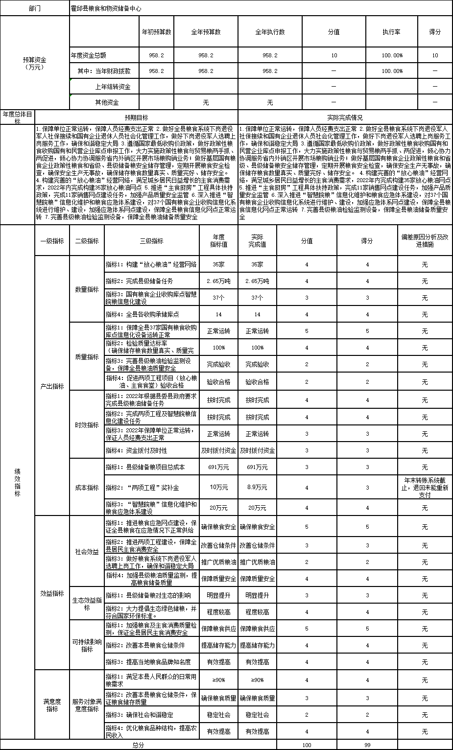 霍邱县粮食和物资储备中心2022年度部门项目支出绩效自评结果