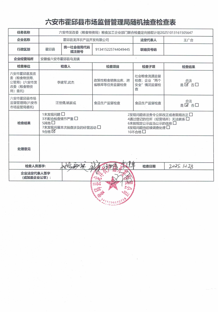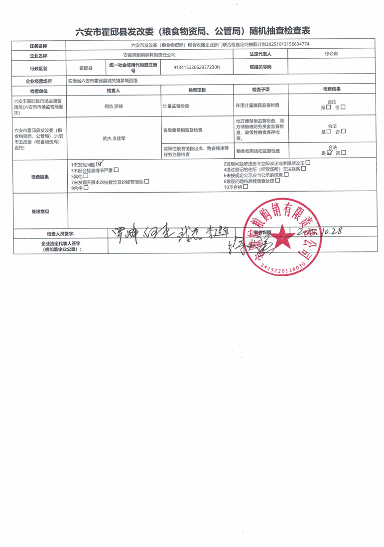 霍邱县粮食和物资储备中心关于霍邱县2025年10月“双随机、一公开”定向抽查结果的通知